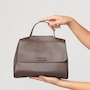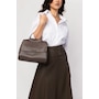 The classic and roomy Grecia from Katherine Karambelas is a top handle leather handbag with an adjustable crossbody strap. It features a front flap with a magnetic closure, a zipper pocket, interior compartments, and finished with attractive silver metal hardware.