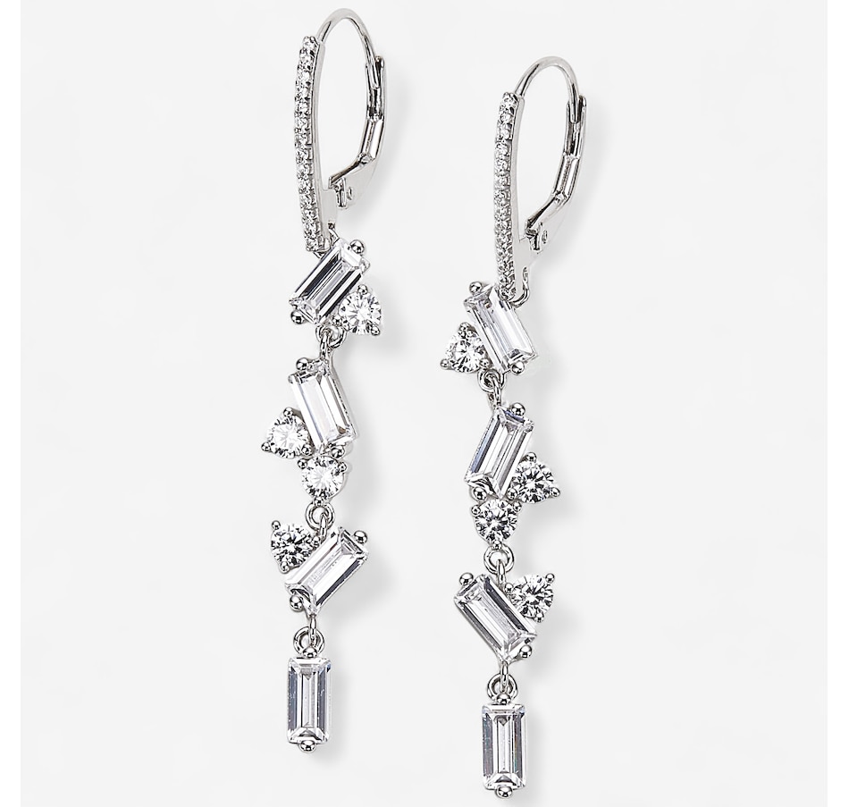 Sterling Silver Rhodium Plate Baguette & Round Diamonelle Drop Earrings
