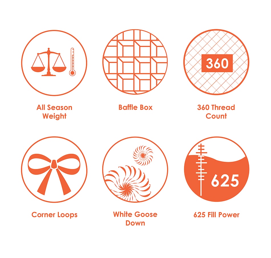 This duvet is filled with care in Canada. The down-proof cotton shell is made of soft 360-thread count, and the duvet is filled with quality, ethically sourced 625-loft down. The down fill is soft and luxurious, made up of tiny, fluffy clusters and makes for light, yet high performance, duvets.