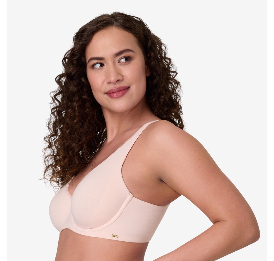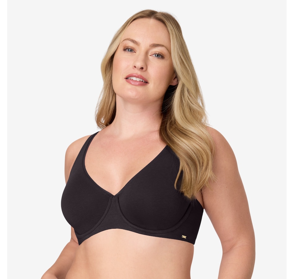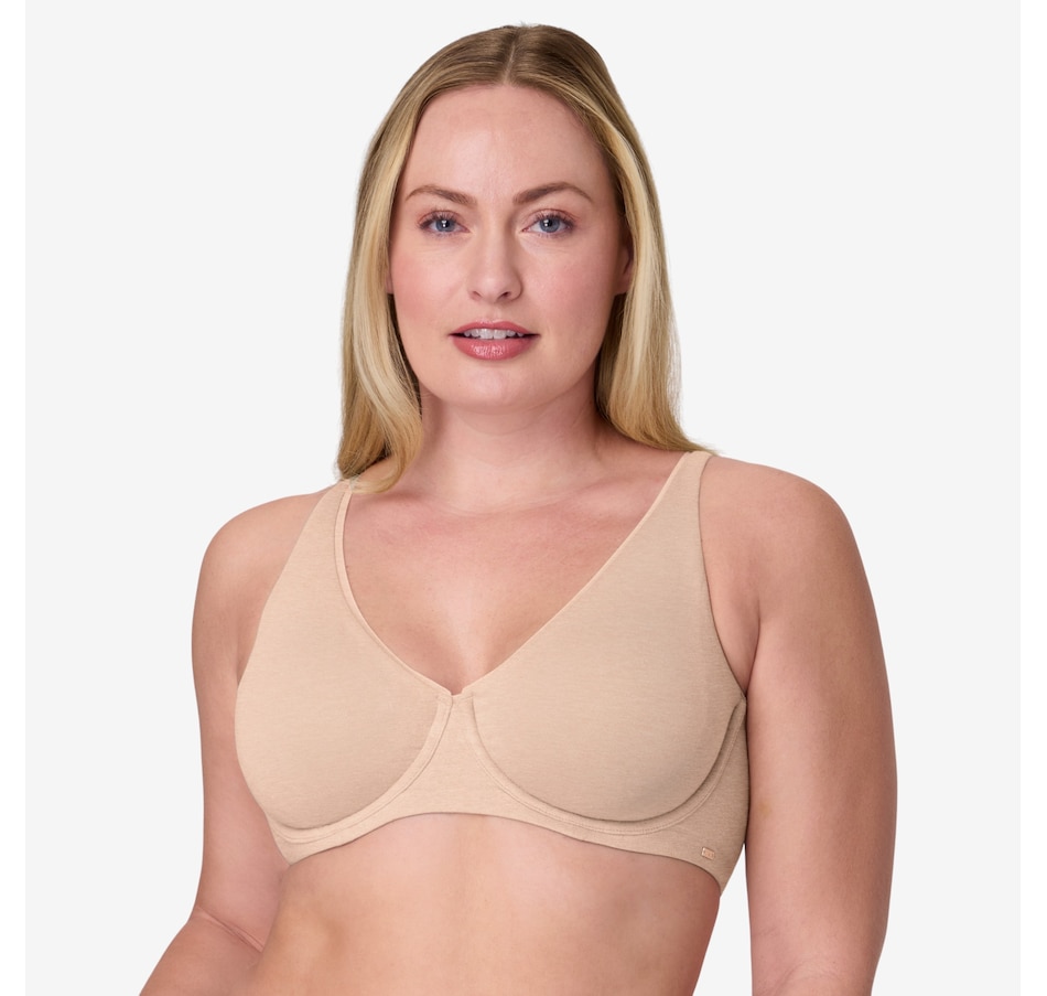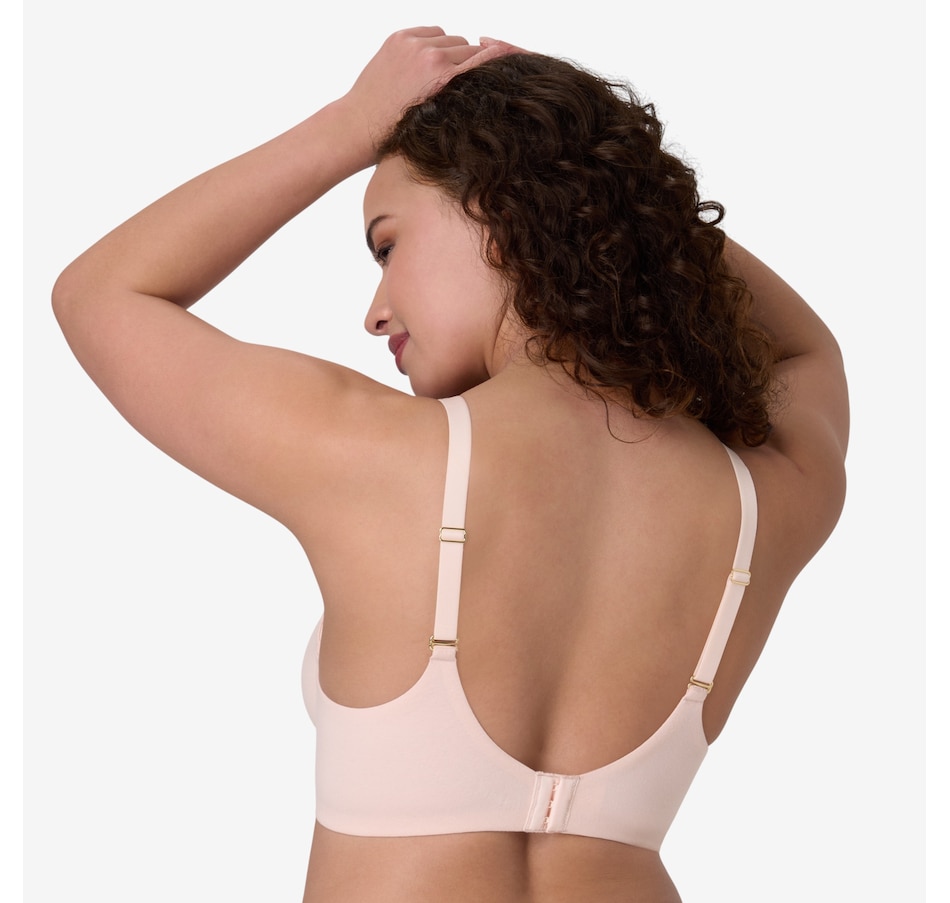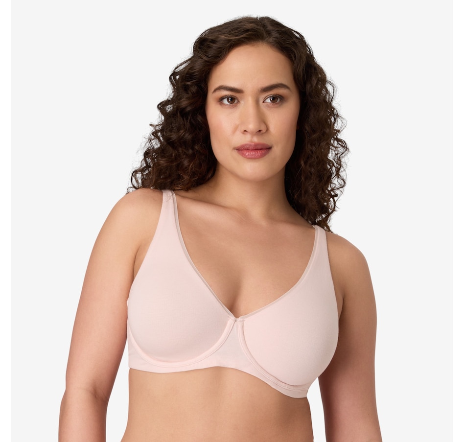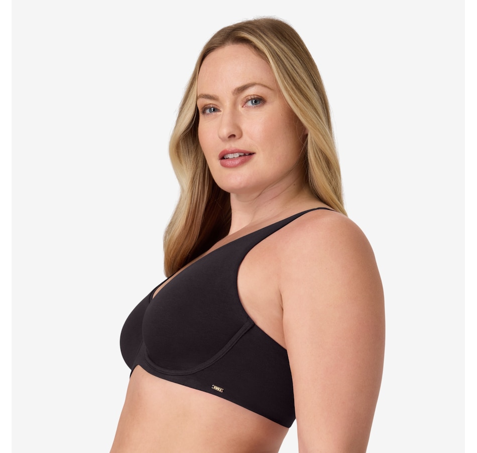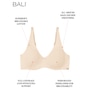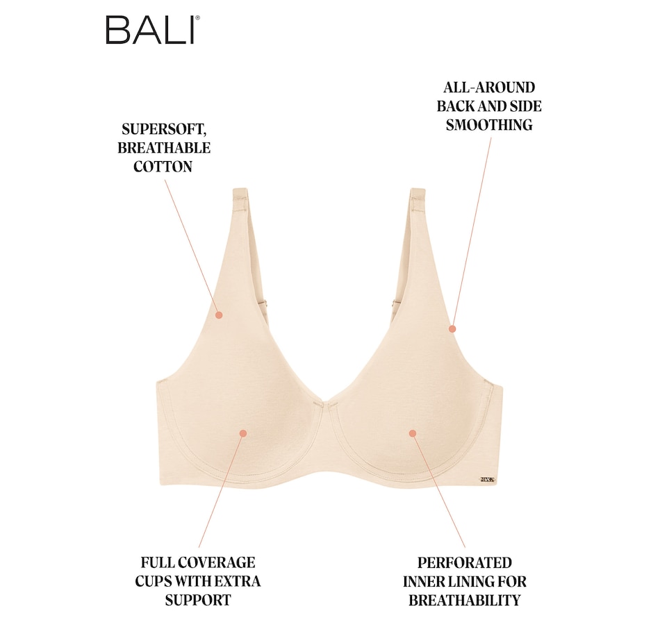 The Bali Cotton Collection 2-ply underwire bra offers the ideal combination of comfort and style, keeping you supported and at-ease all day. Crafted from a moisture-wicking cotton-spandex fabric with spacer-lined cups, this bra offers just the right amount of breathability, shaping and support to keep you feeling cool and confident. The ultra-soft, fine gauge stretch cotton-spandex feels smooth against your skin, with no elastics digging in, while the built-up sides and back give you a sleek, smooth fit. It also features an inner sling for extra lift and support, with fully adjustable, convertible straps, allowing for a custom, stay-put fit. Finished with delicate organza trim and subtle gold branding for a touch of style, this underwire bra will quickly become your go-to everyday essential.