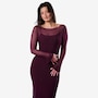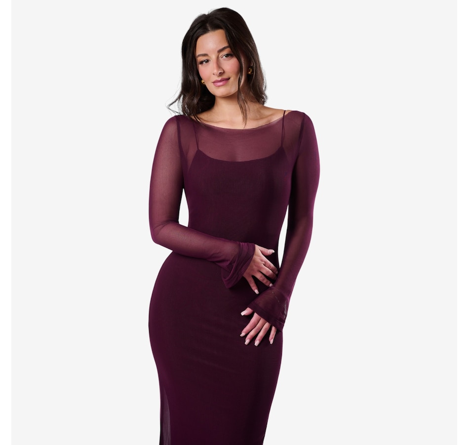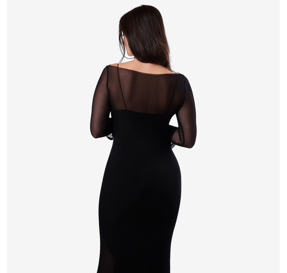 The Rowena from Katherine Karambelas is a body hugging maxi dress with classic spaghetti straps. It features a high neckline, a mesh sheath cover-up with a bateau neckline, and finishes with a sophisticated, slightly flared mesh sleeve.