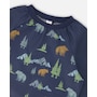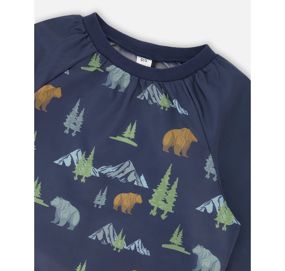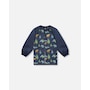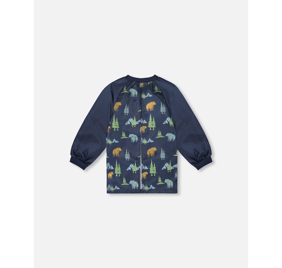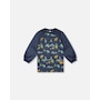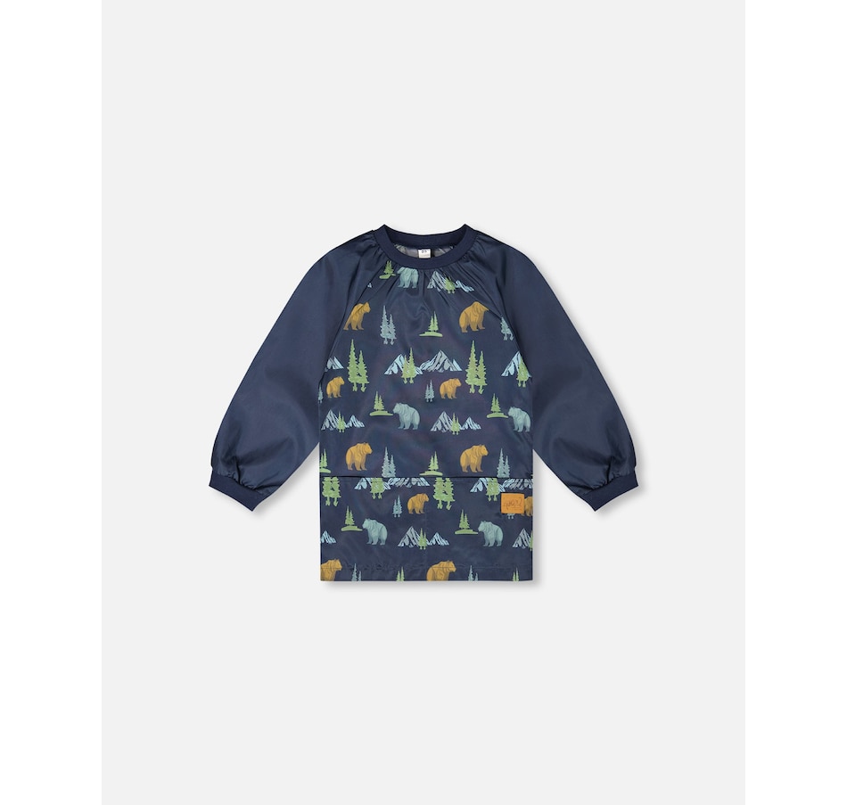 Make art class your most stylish moment of the day with our navy animal print smock. In fabric made from recycled plastic bottles, this eco-friendly school apron features a long raglan sleeve silhouette with double front pockets, a round neckline, elasticated wrists, and a water-resistant finish..