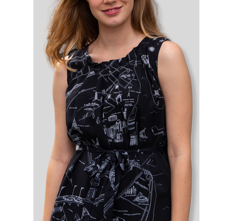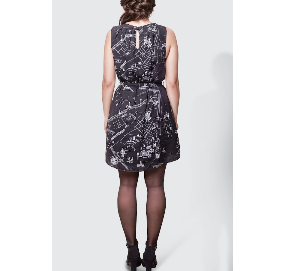 Our Iconic 'La Métropolitaine' dress is designed with an original custom illustration print-an artistic map of Montréal with its most iconic places.