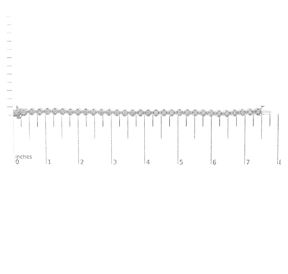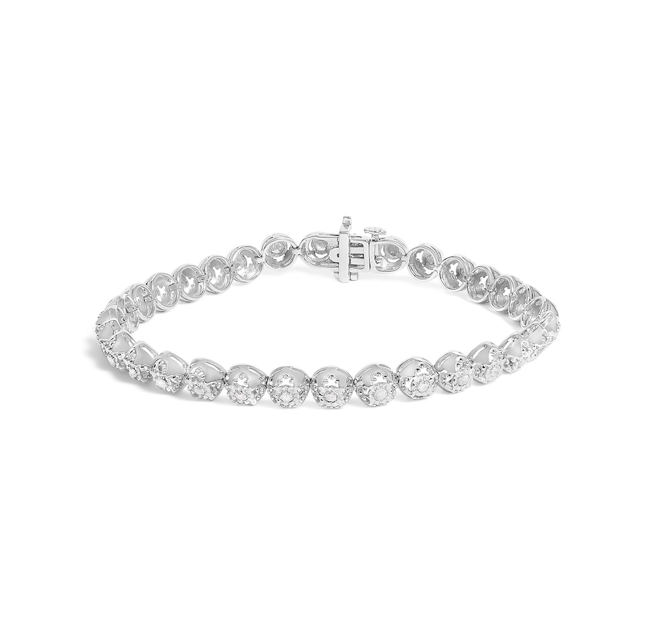 Elegant and timeless, this sterling silver link bracelet features 1.0 carat total weight of round, rose cut, promo quality diamonds with 32 stones in all. The tennis bracelet features round links with illusion set diamonds in our unique miracle-plate setting, which centers each diamond in a mirror-finish, high-polish frame that gives the illusion of a much larger stone. Each stone is centered with petals of silver folding in creating a recessed quatrefoil flower shape. Rose-cut, promo quality diamonds are milky and cloudy in nature. The 7” bracelet fastens with a box clasp and is crafted of real 92.5% sterling silver that has been electro-coated with genuine rhodium (a platinum-family metal), ensuring it will keep a tarnish-free shine for years to come. This classic tennis bracelet makes a great gift for any special occasion! Whether worn for daytime glamour or evening sparkle, this bracelet is gorgeously versatile. Give her a gift that will perfectly complement her favorite ensemble.