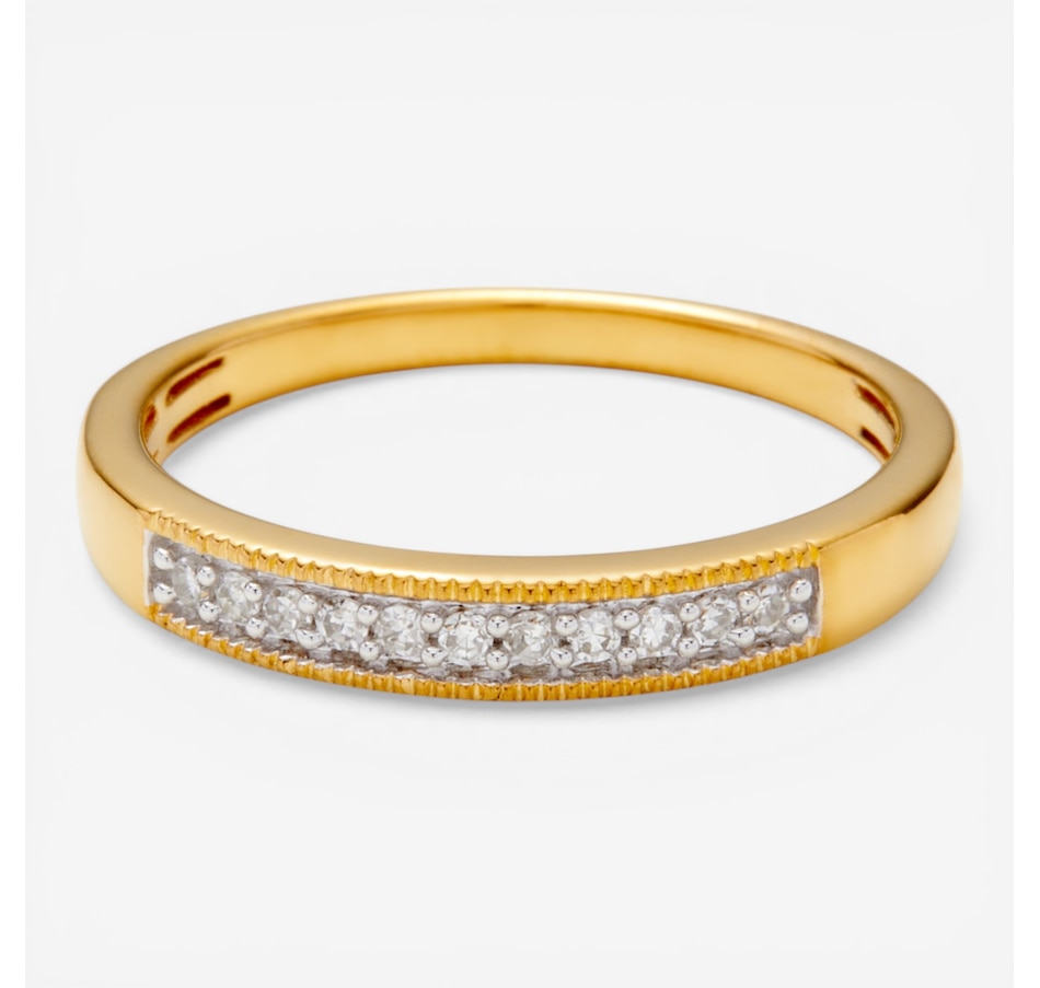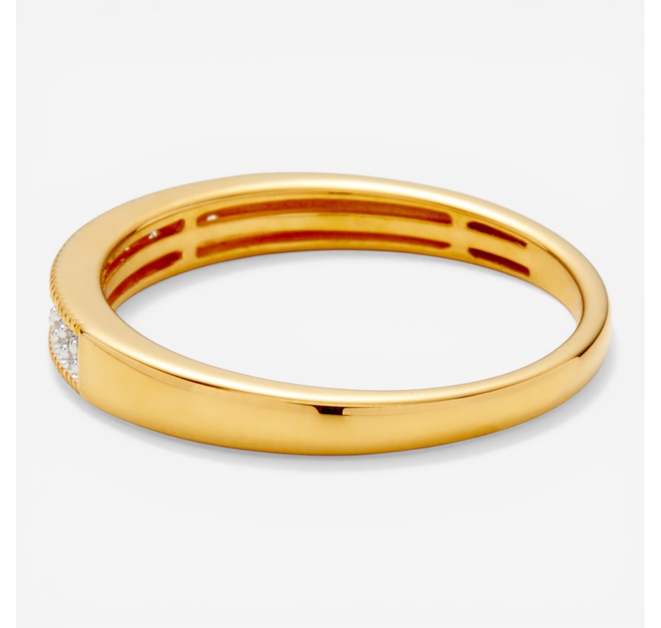 This delicate diamond band offers understated elegance through a slim, refined design finished with warm yellow gold plate accents. Prong‑set lab grown diamonds add subtle sparkle, making it an ideal piece for everyday wear or effortless stacking. Simple and versatile, it’s a polished ring with timeless appeal.