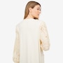 This cardigan features rib trims at the cuffs, a placket and bottom opening. It also has woven combo fabric sleeves and rib pockets with ruffle detail at the opening edge.