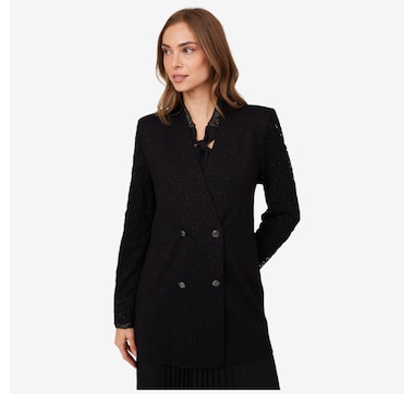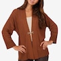 Perfect for layering over basic tops and slim-fit trousers, this knit cardigan from Aggel features a decorative metallic front clasp and a hip-length silhouette. Lightweight and relaxed, it’s an elegant staple with a subtle shimmer.