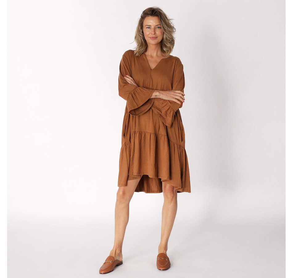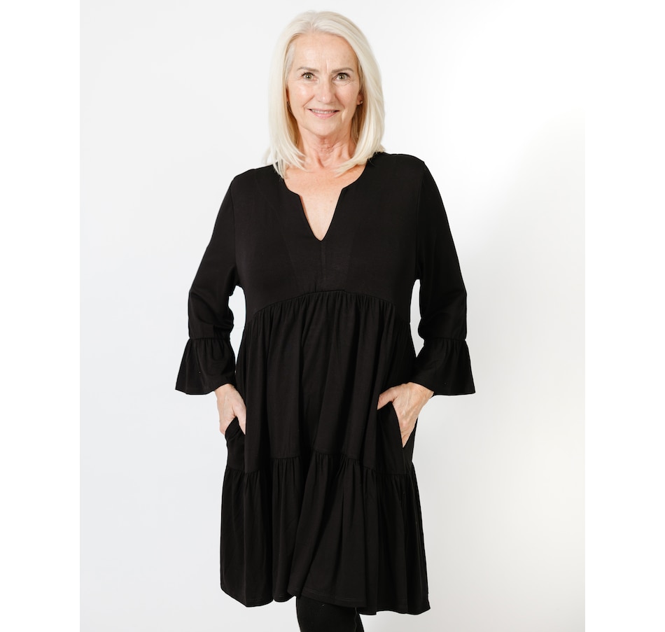 Elevate your style with this jersey tiered dress, a perfect blend of chic fashion and everyday comfort. Featuring 3/4 sleeves and convenient pockets, this dress is designed to meet your fashion needs while keeping you effortlessly comfortable. Whether you're attending a special occasion or simply enjoying a casual day out, this dress promises a fashionable statement and practicality that suits any occasion.