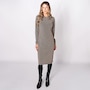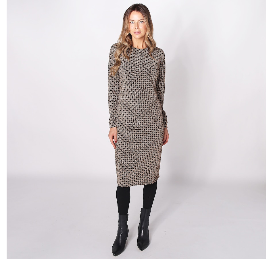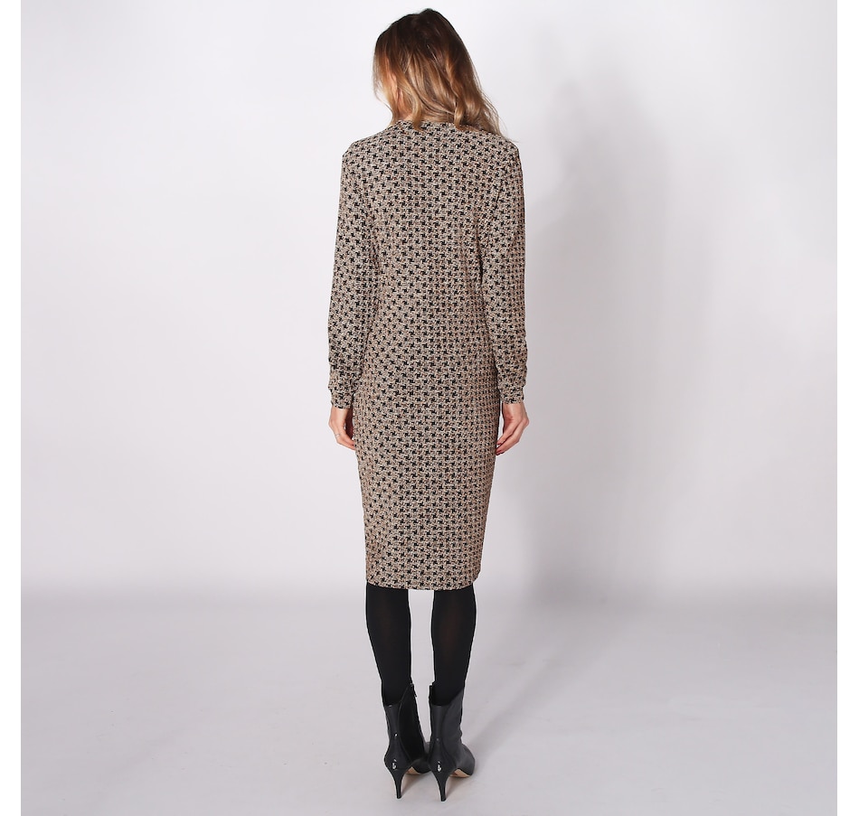 The brand new material of this dress captures two exciting current trends, metallic shimmer and menswear patterns. It is a simple and classic shape that is appropriate for all styles and body types. The bronze colour is rich and sophisticated, and the fabric is very comfortable with a lot of stretch. This piece can be incorporated into a holiday look or worn year round when a bit of sparkle is called for!