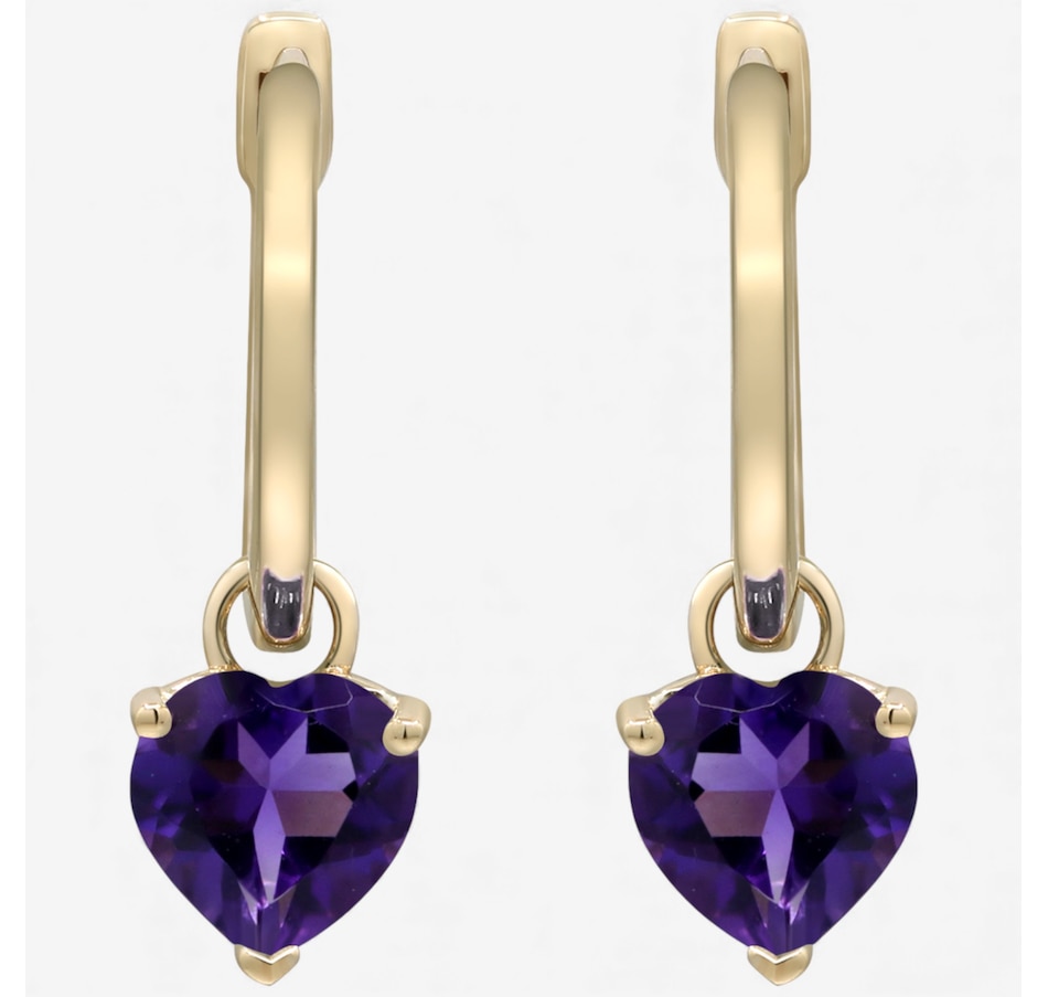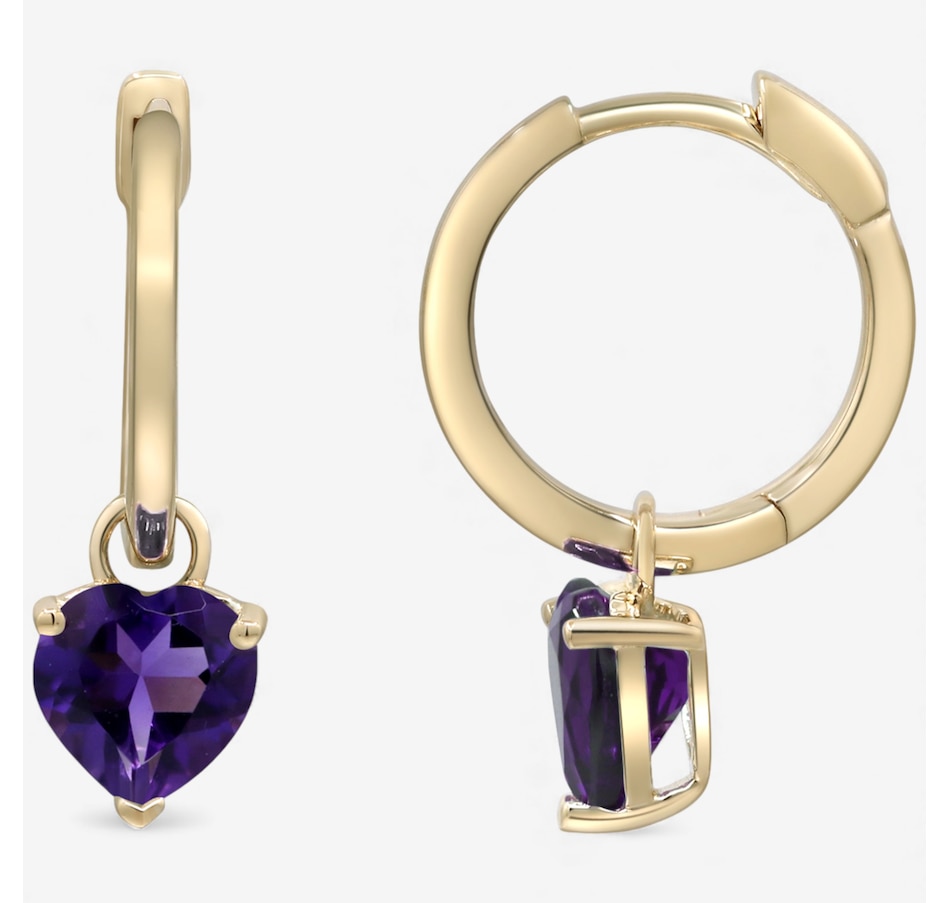 Add a sweet and elegant touch to your look with these 10K yellow gold earrings from Cirari, featuring vibrant heart-shaped amethyst gemstones. Each stone is prong-set to showcase its brilliance, while the hinged back with a push-in closure ensures a secure, comfortable fit. Made in China and nickel free, these earrings are perfect for adding romantic charm to any occasion.