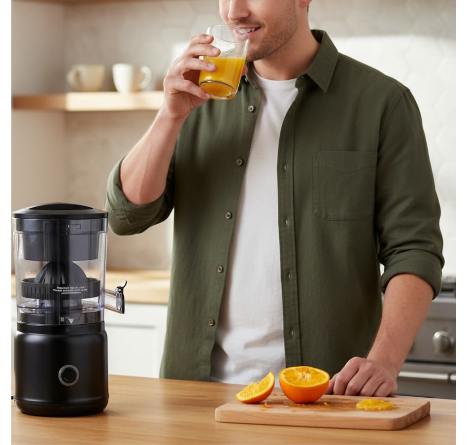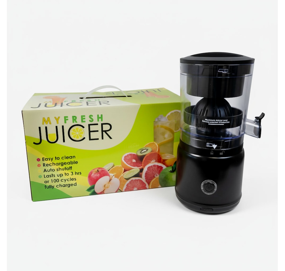 Introducing the MYFRESH juicer, your portable, cordless citrus companion that delivers fresh-squeezed juice in seconds. Whether you're at home, at the office, or on the go, this USB-rechargeable juicer makes it easier than ever to enjoy your daily dose of vitamin C and other nutrients, without the cords, clutter, or cleanup.