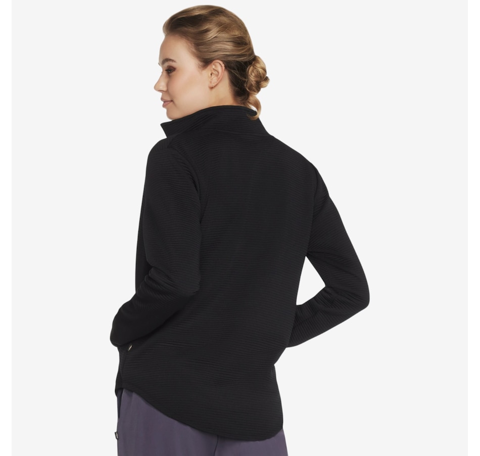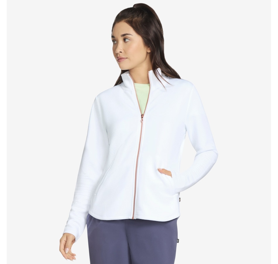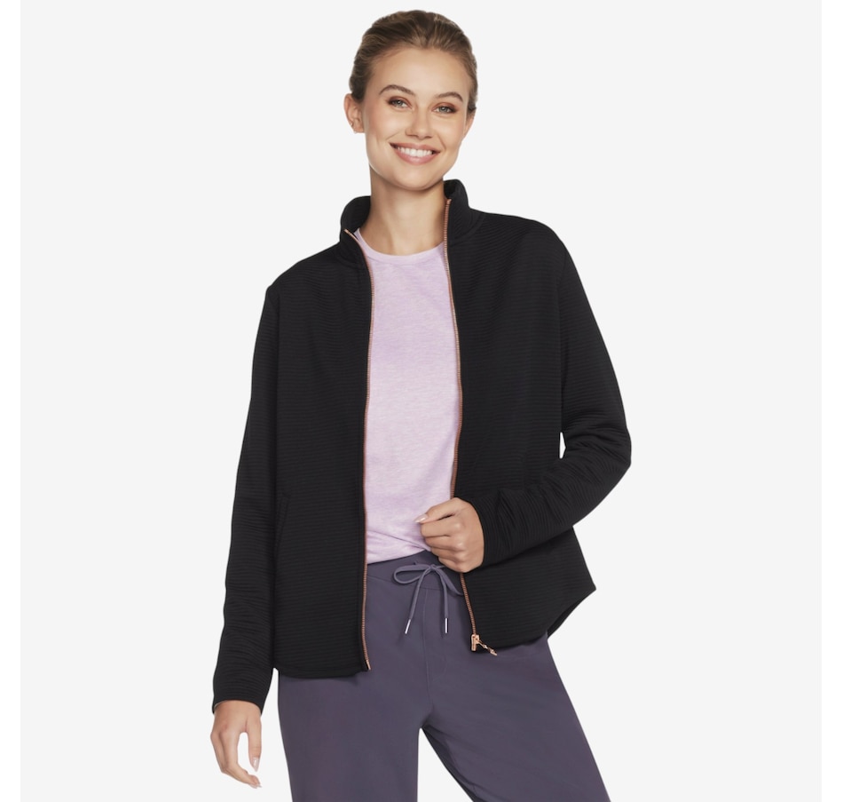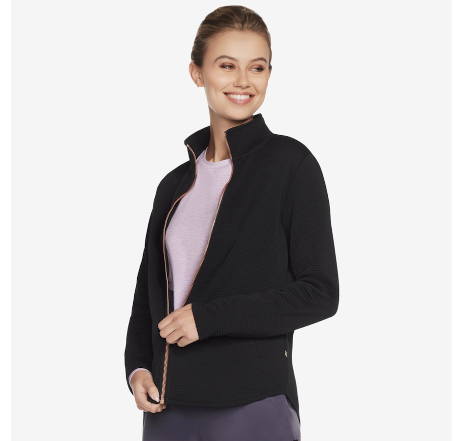 Add a subtle touch of shine to your everyday layers with the GoWalk Shine full‑zip mock neck jacket from Skechers, where casual comfort meets modern style. Designed in Skechers Soft Knit Ottoman® fabric, this ribbed jersey is crafted from recycled polyester that meets the Global Recycled Standard, delivering breathable comfort with a softly structured feel you’ll love. The mock neck and full‑zip front create a sleek, sporty silhouette, while the scooped hem adds flattering coverage and easy movement. Welt pockets keep the look clean and functional, and the signature diamond‑branded zipper pull adds a refined finishing touch.