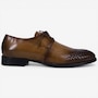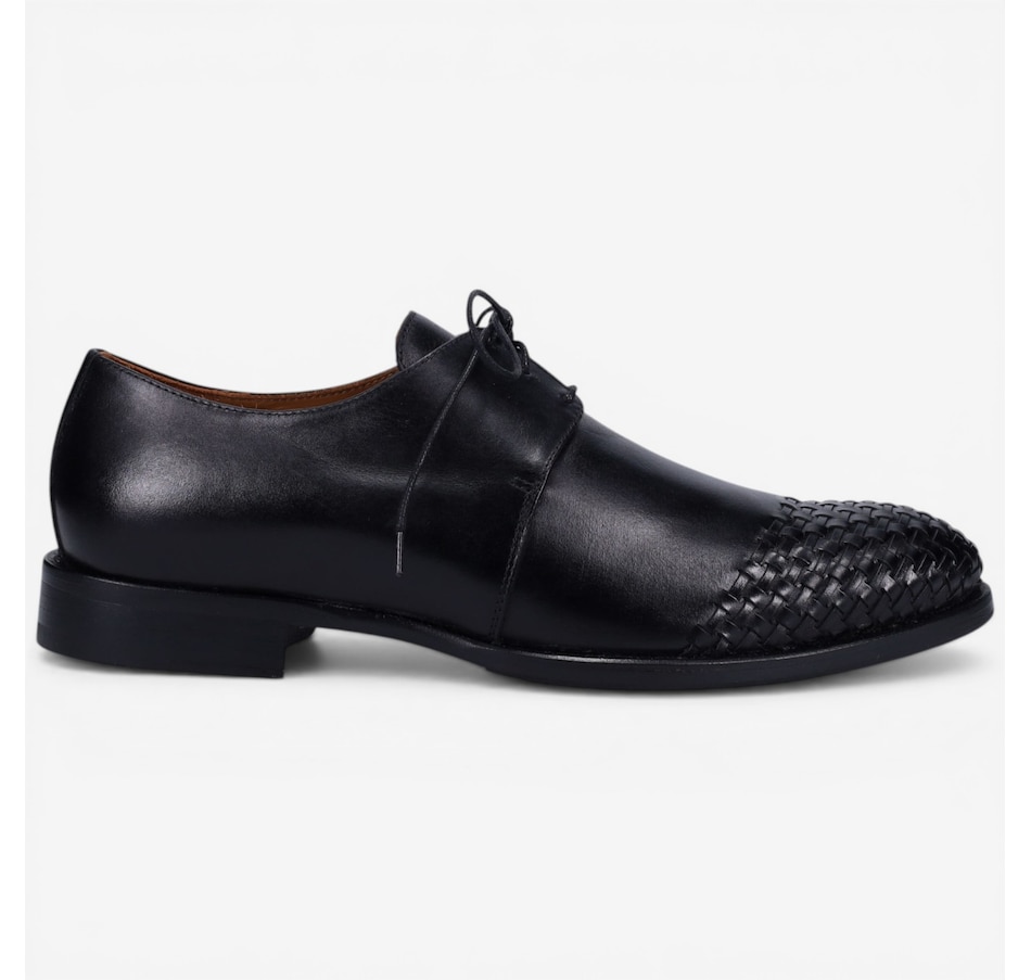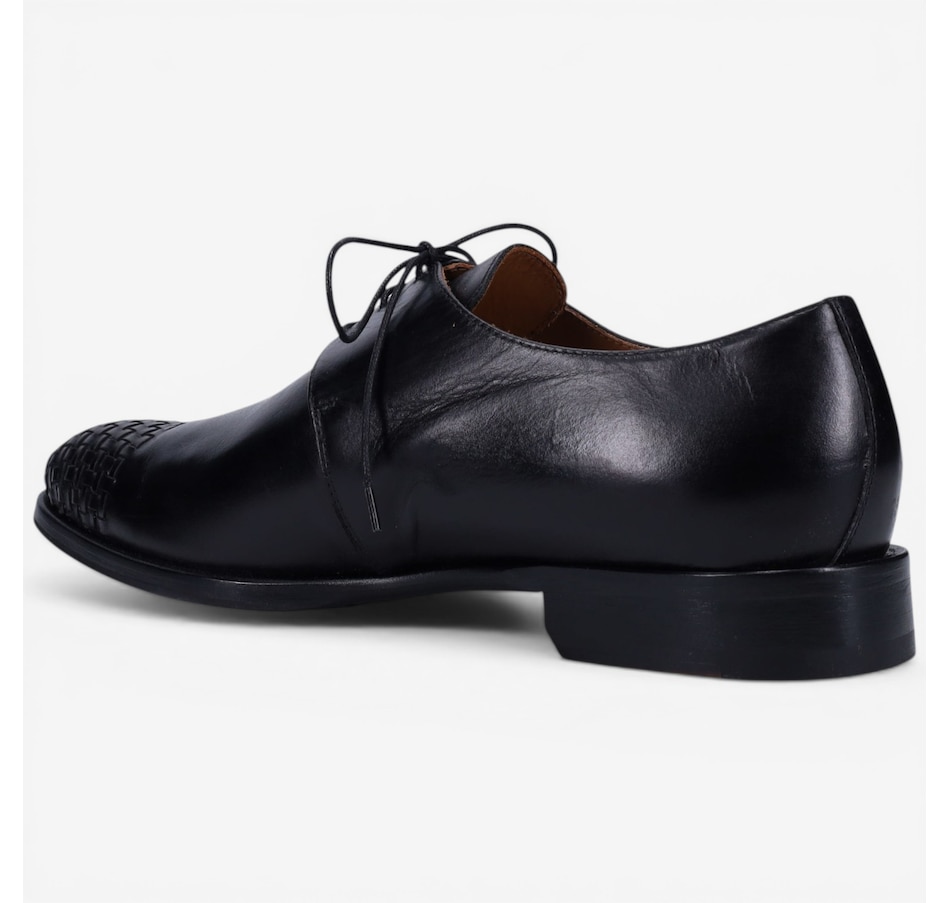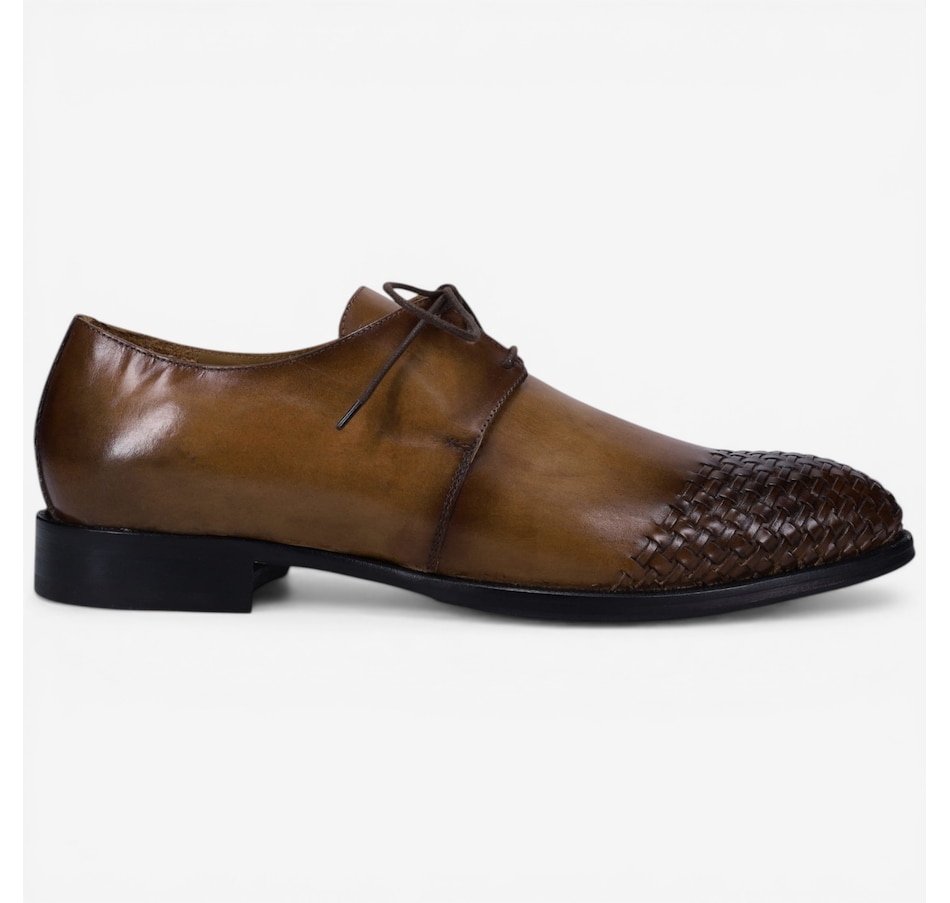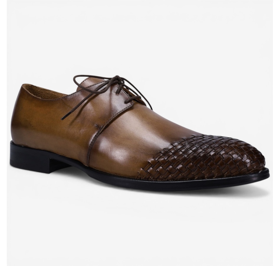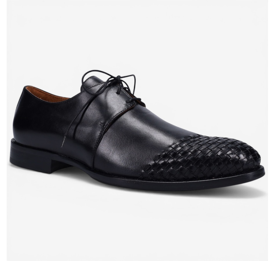 Russell Oxford in Antiqued Calf with Woven Calf detail. Arch Support and Double Padding. True Blake Construction. Made in Italy.