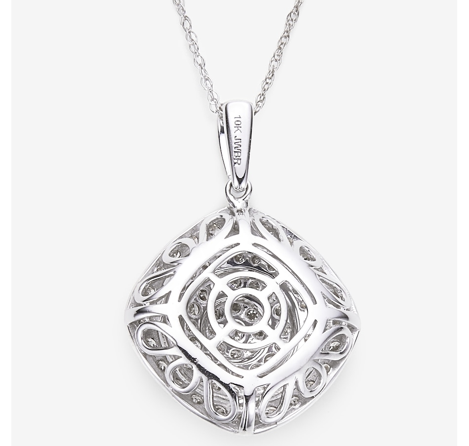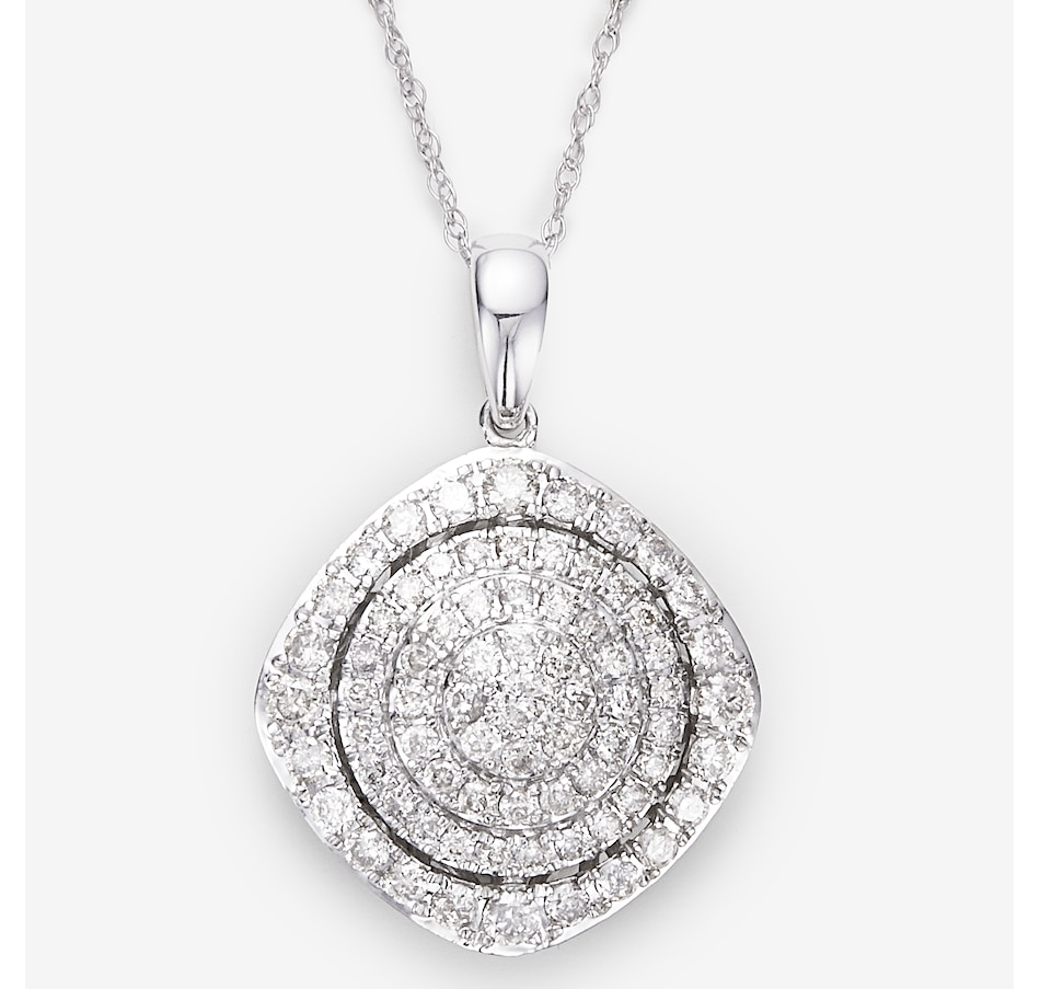 This diamond pendant features beautiful round diamonds for a sharp and versatile look. Add some flair to your daytime outfit, or let the diamonds shine all night long. This piece makes the day-to-night transition simple; you'll find yourself reaching for it again and again. Add this versatile pendant to your collection today right here at TSC!