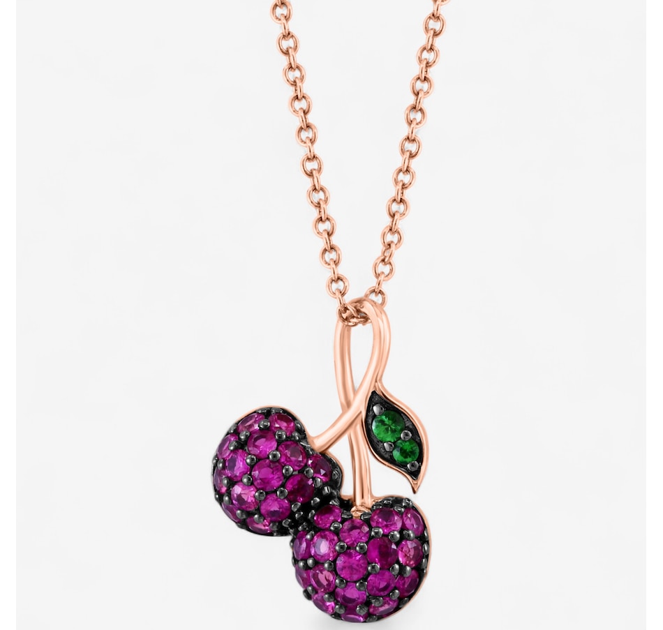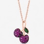 Playful yet luxurious, this 14K rose gold pendant captures the sweetness of nature with two ruby-studded cherries and a tsavorite-accented leaf. Its vibrant hues and sparkling details make every glance unforgettable. This charming piece celebrates bold colour and timeless elegance all at once.