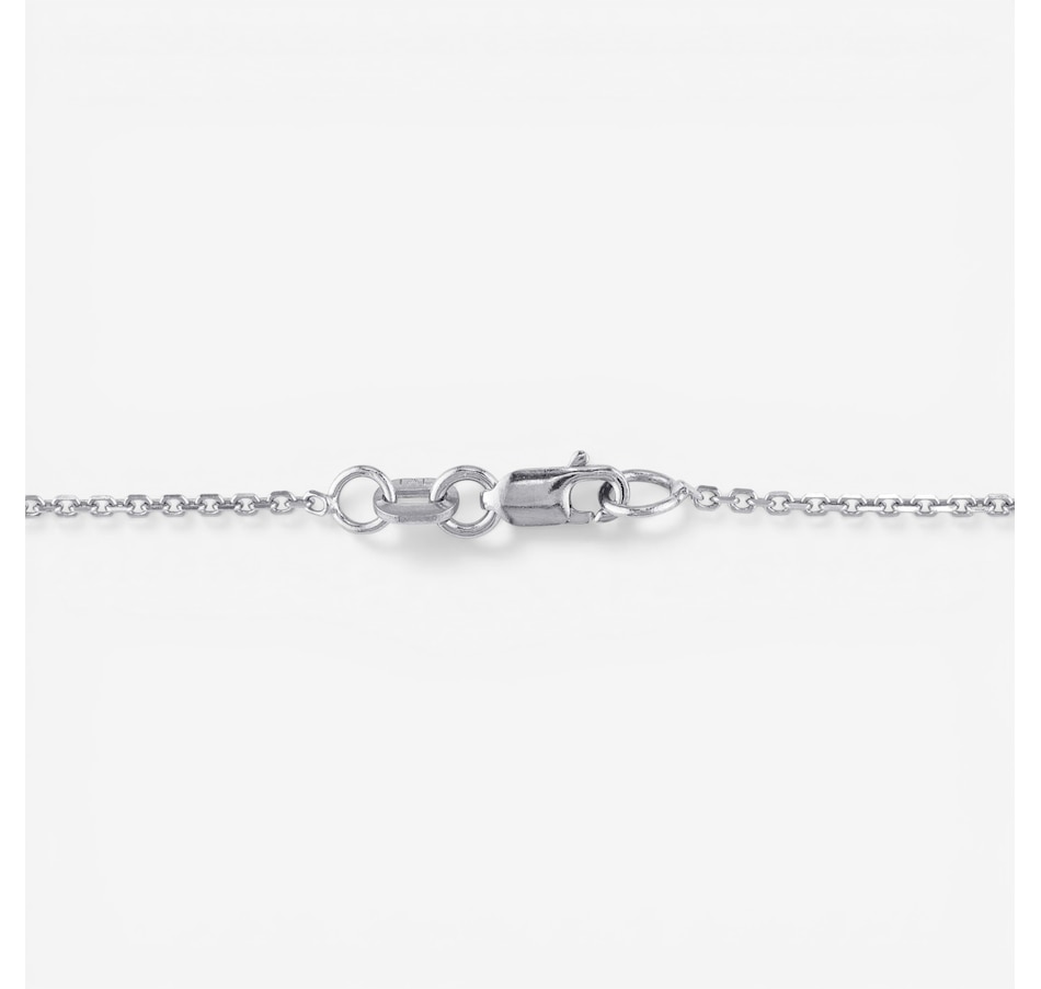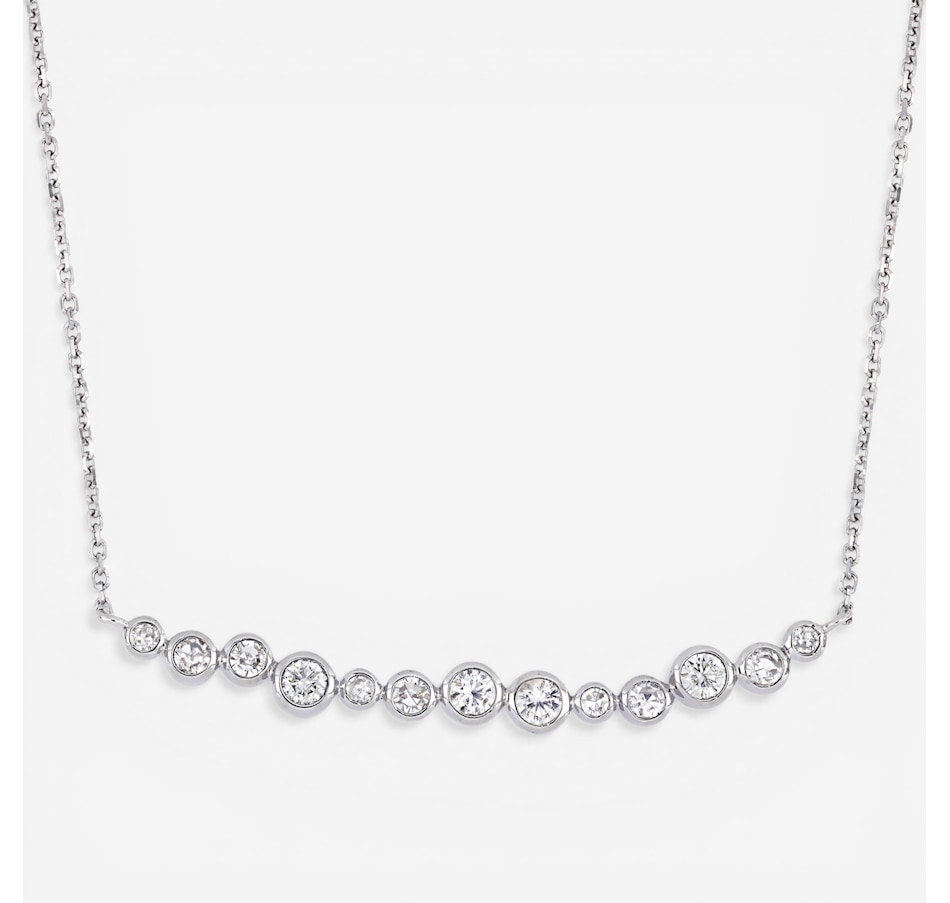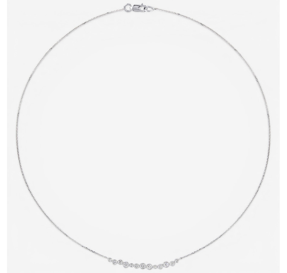 This necklace showcases the refined brilliance of bezel‑set diamonds arranged in a polished white gold design. The faceted stones add elegant sparkle across the sleek, minimal silhouette, creating a timeless look with radiant shine. Paired with a classic chain, the piece brings understated sophistication to any jewellery collection.