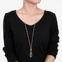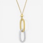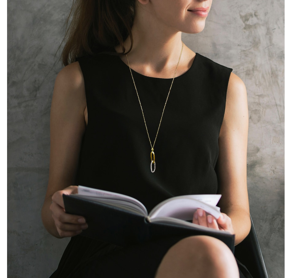 This pendant showcases the refined brilliance of pavé‑set diamonds arranged along a polished link‑lariat design. The faceted stones create radiant sparkle and elegant movement, while the elongated silhouette brings a sleek, modern touch. Paired with a long chain, the piece offers striking sophistication and timeless shine.