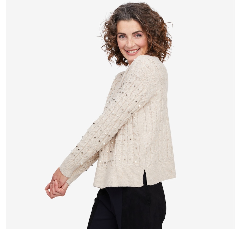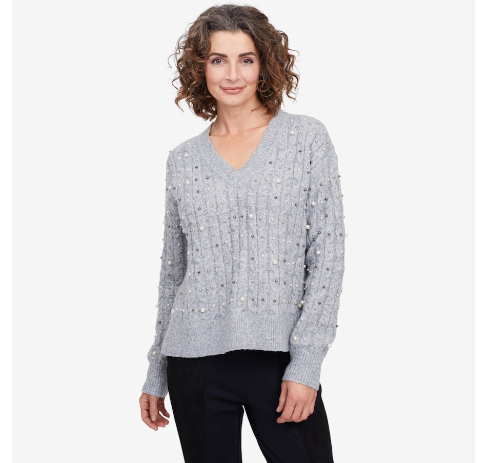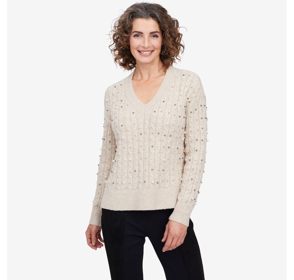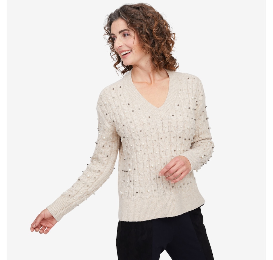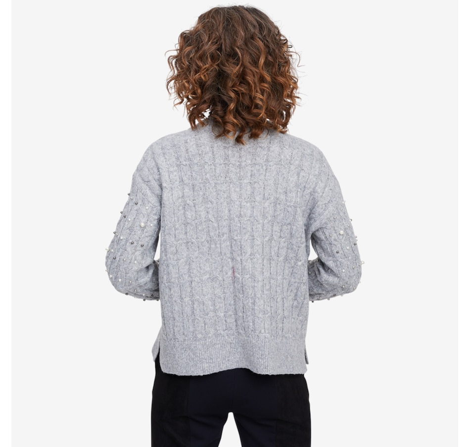 This beautiful pullover from TWRHLL features a cable stitch body and sleeves, and a gorgeous multi-pearl embellishment at the front and sleeves. It also features a v-neck with rib trim and an easy body fit for versatile wearability.