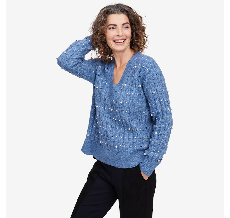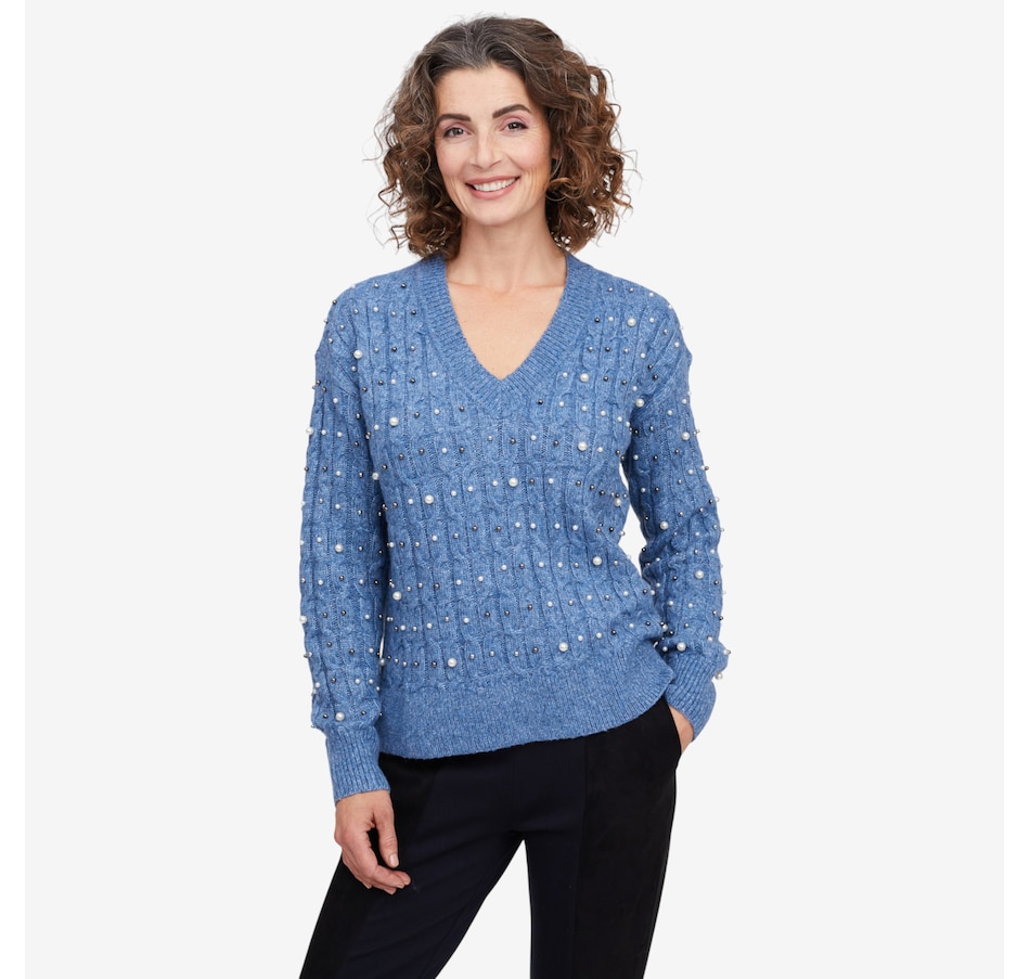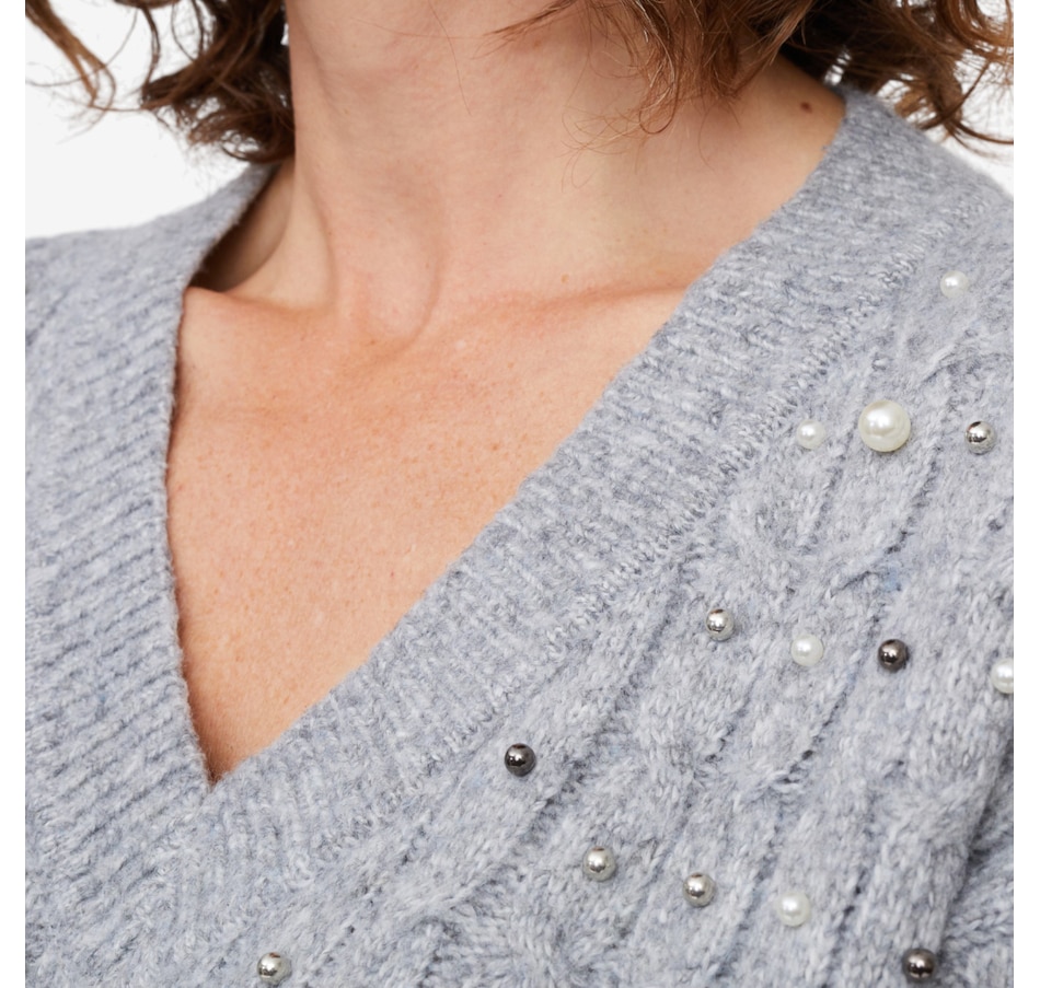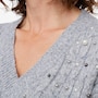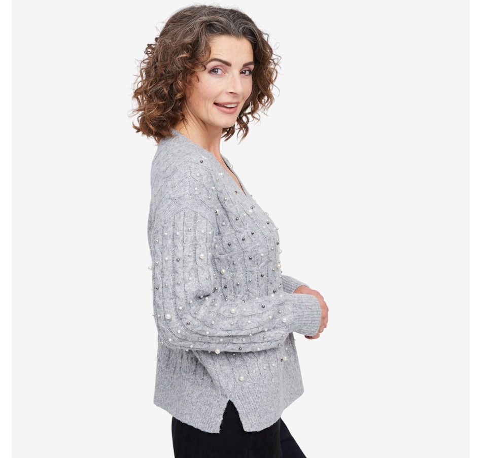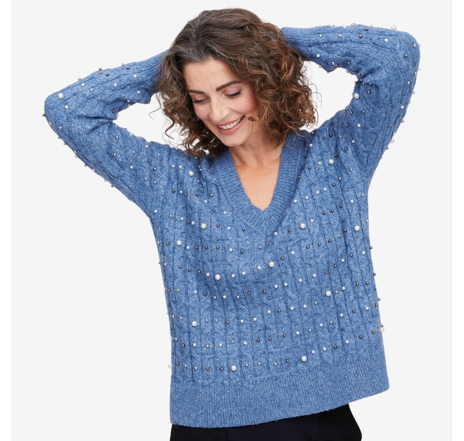 This beautiful pullover from TWRHLL features a cable stitch body and sleeves, and a gorgeous multi-pearl embellishment at the front and sleeves. It also features a v-neck with rib trim and an easy body fit for versatile wearability.
