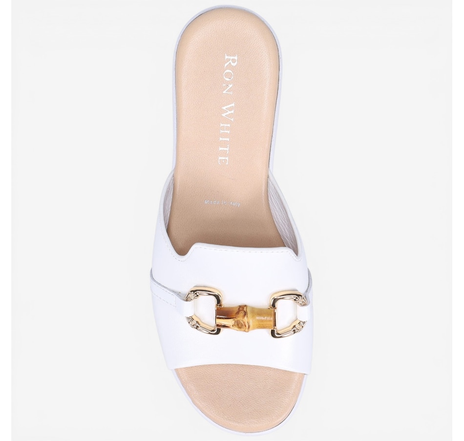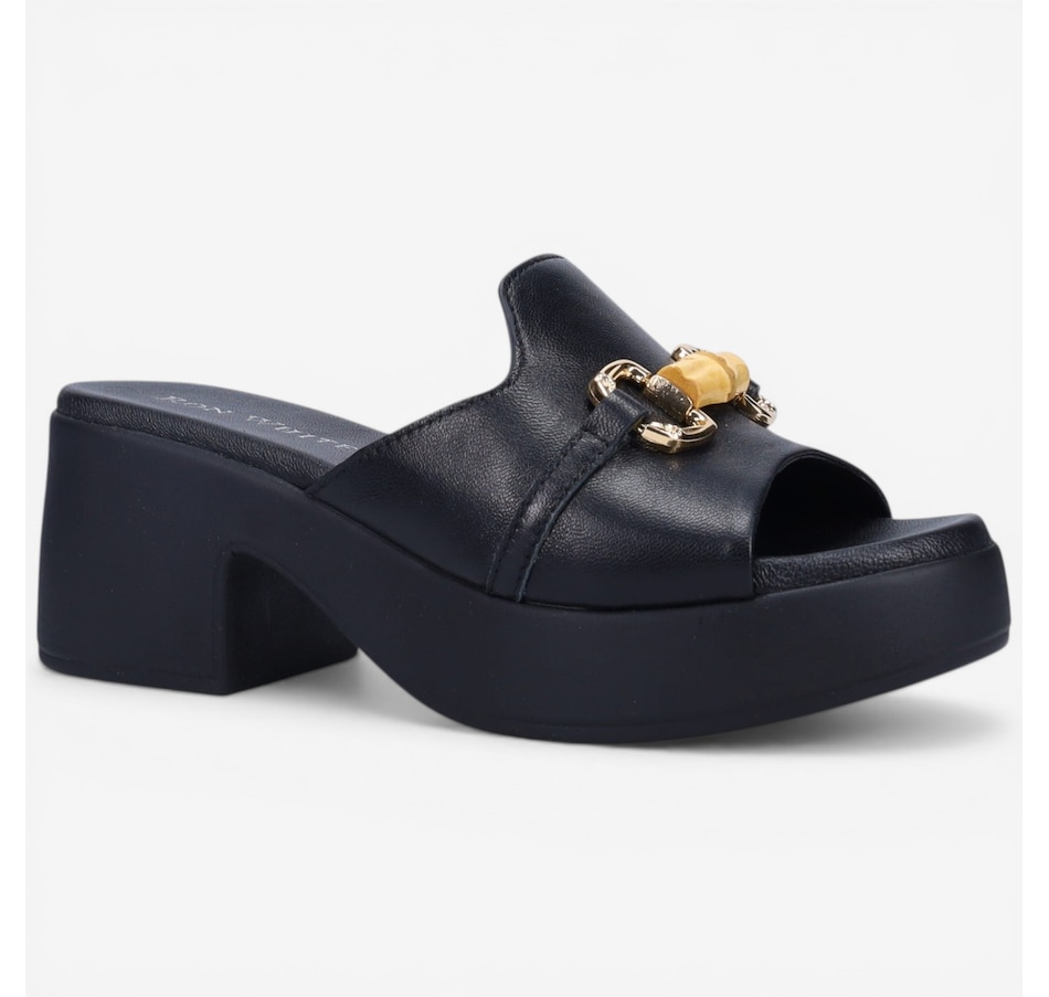 Make a confident style statement with the Gwyna platform slide from Ron White, where bold design meets signature comfort. Crafted in buttery‑soft Nappa leather and finished with an elegant horse‑bit detail, this elevated slide brings refined polish to warm‑weather looks. Underfoot, Ron White’s unique pillow construction delivers indulgent comfort with thick 5mm gel‑injected foam cushioning and ultra‑soft uppers that support every step. A feather‑light outsole keeps the silhouette easy and wearable, all made with impeccable craftsmanship.