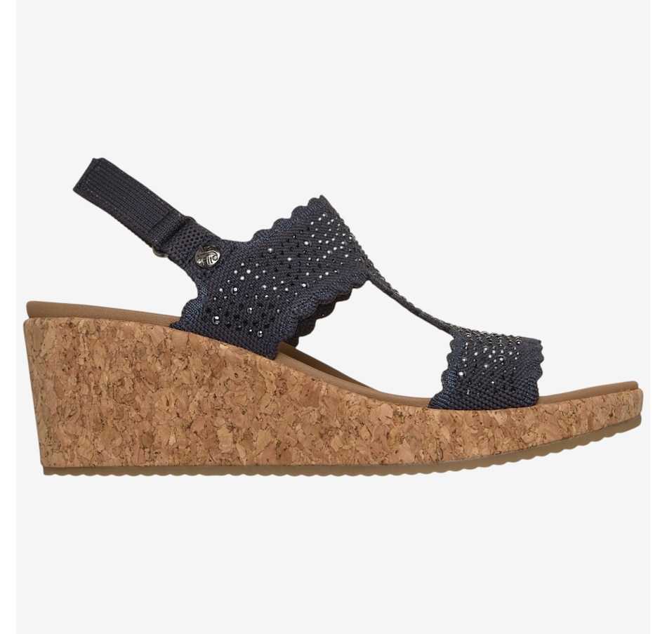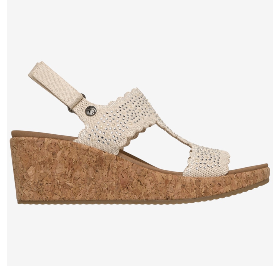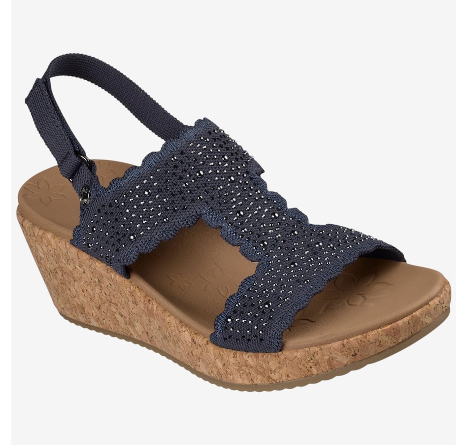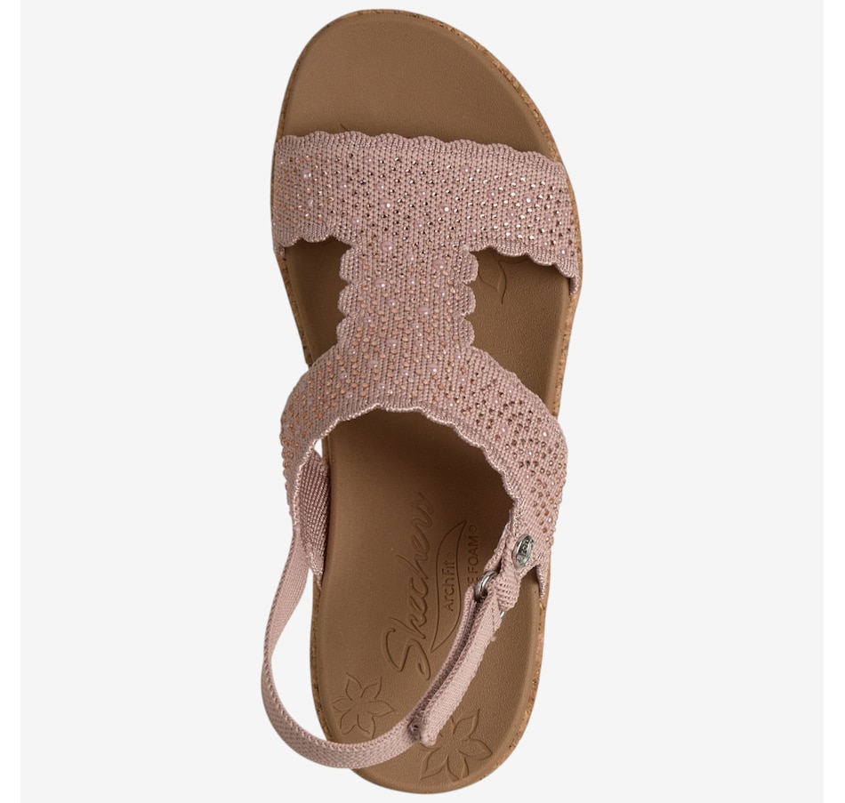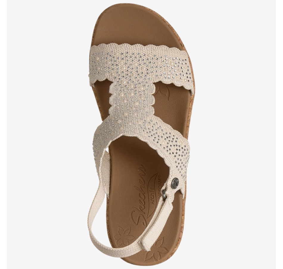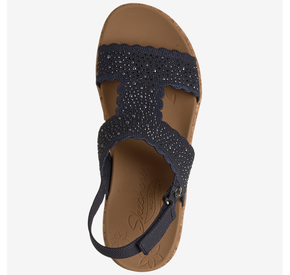 Shine through every sunny moment with the Skechers Arch Fit Beverlee 2.0 My Fav Adjustable embellished knit wedge sandal, a glamorous blend of sparkle, support, and warm‑weather comfort. The rhinestone‑embellished knit upper, complete with elegant scalloped trim, adds eye‑catching style to every step, while the adjustable heel strap means a secure, customized fit. Underfoot, the patented Arch Fit® contoured footbed, designed with 20 years of podiatrist‑driven research, molds to your foot to reduce shock and evenly disperse weight, elevated by plush Luxe Foam® cushioning for lasting comfort. Finished with a flexible rubber traction outsole and crafted from 100% vegan materials, this wedge sandal pairs chic sophistication with all‑day ease.