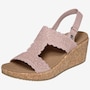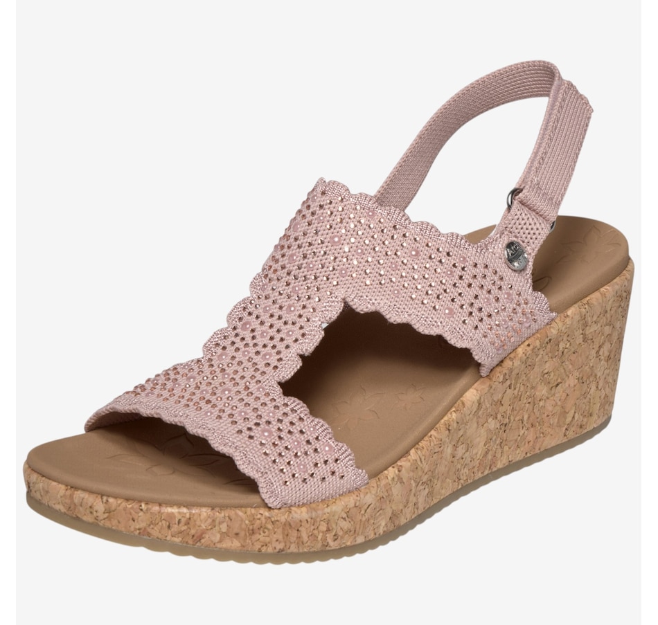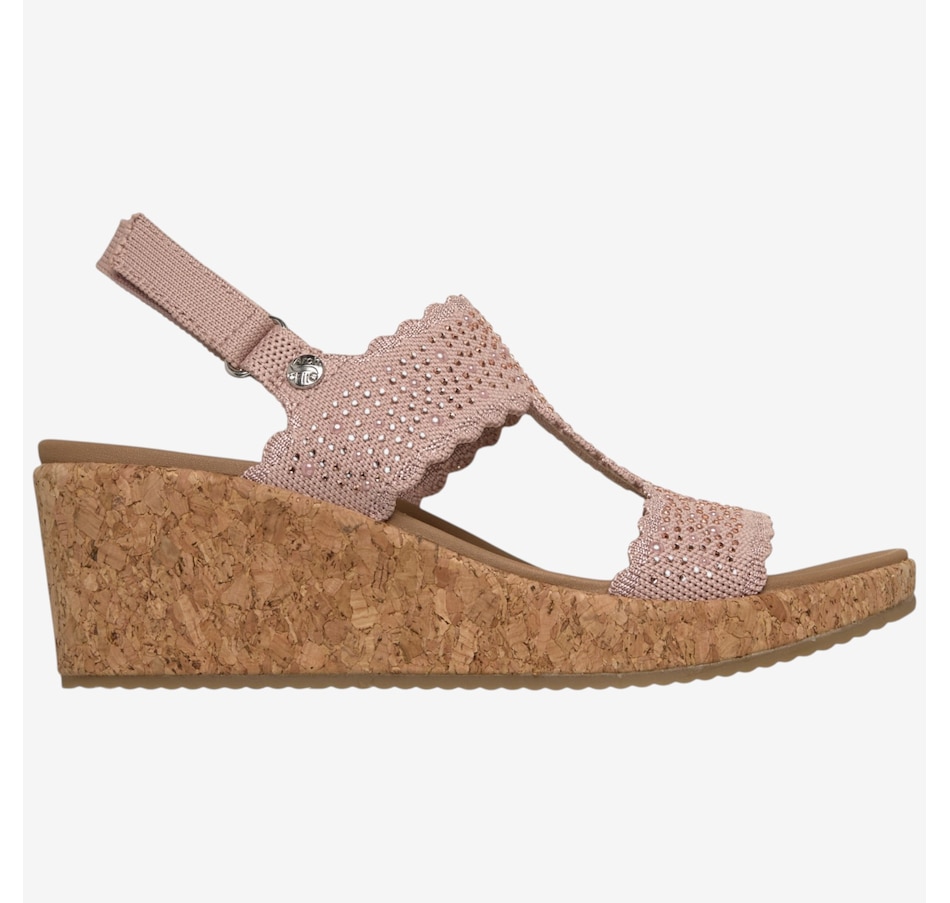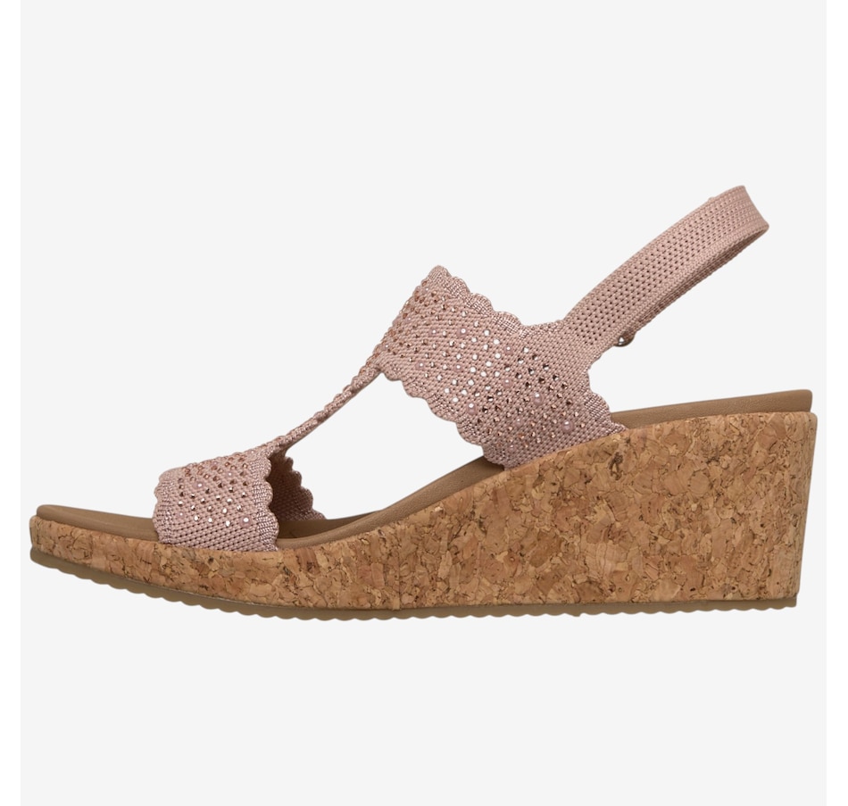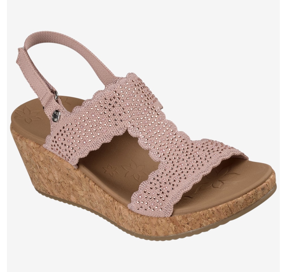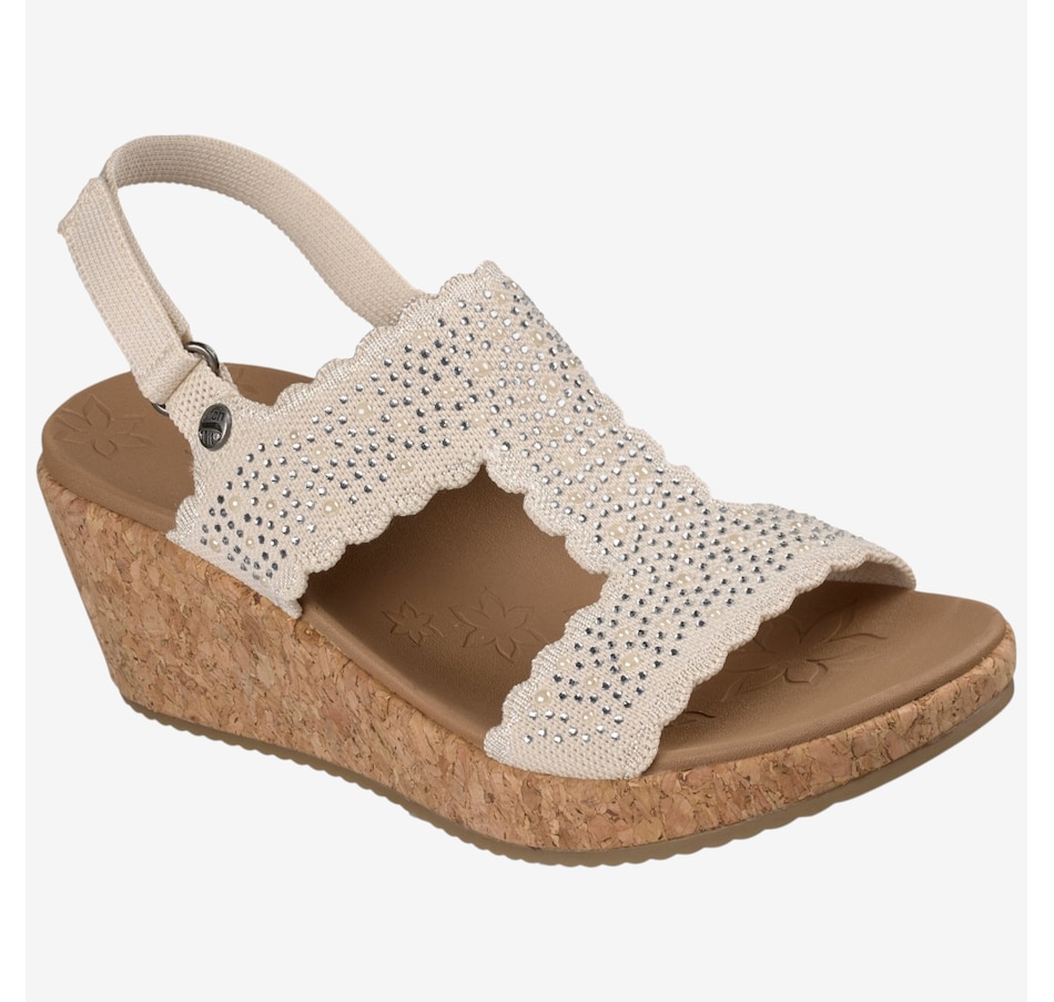 Shine through every sunny moment with the Skechers Arch Fit Beverlee 2.0 My Fav Adjustable embellished knit wedge sandal, a glamorous blend of sparkle, support, and warm‑weather comfort. The rhinestone‑embellished knit upper, complete with elegant scalloped trim, adds eye‑catching style to every step, while the adjustable heel strap means a secure, customized fit. Underfoot, the patented Arch Fit® contoured footbed, designed with 20 years of podiatrist‑driven research, molds to your foot to reduce shock and evenly disperse weight, elevated by plush Luxe Foam® cushioning for lasting comfort. Finished with a flexible rubber traction outsole and crafted from 100% vegan materials, this wedge sandal pairs chic sophistication with all‑day ease.