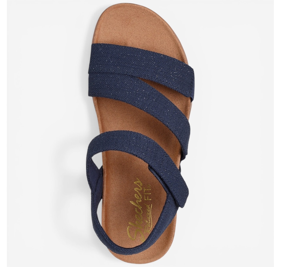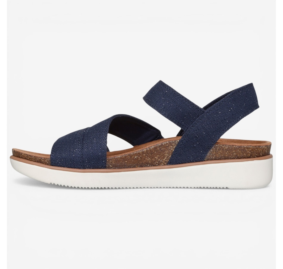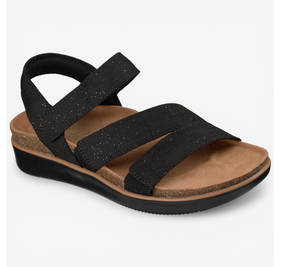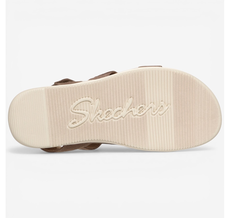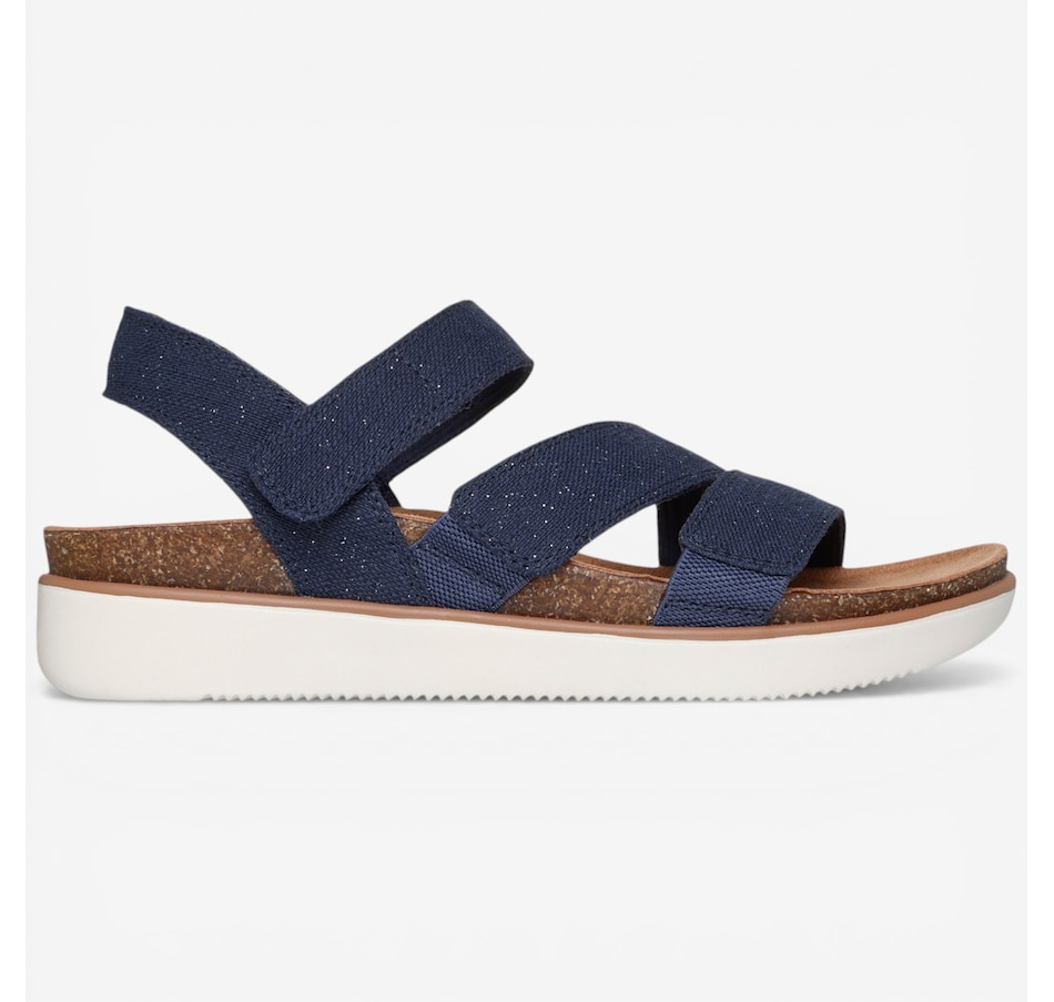 Add shimmer, comfort, and easygoing style to your warm‑weather wardrobe with the Skechers Lifted Comfort Dreamy Eyes adjustable sling back sandal. This strappy canvas design features subtle sparkle detailing that catches the light beautifully, giving every outfit an effortless touch of shine. The convenient hook‑and‑loop slingback closure ensures a secure, customizable fit, while the Relaxed Fit® roomy toe and forefoot design keeps you comfortable from morning strolls to evening outings. A cushioned comfort footbed softens each step, and the flexible traction outsole keeps you steady and supported wherever your day takes you. Crafted from 100% vegan materials, the Dreamy Eyes is a blend of ease, elegance, and everyday comfort.