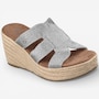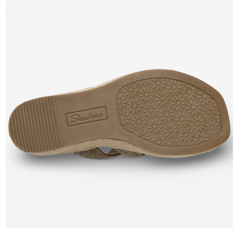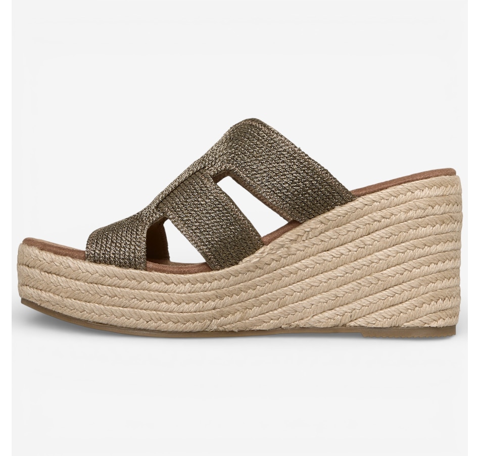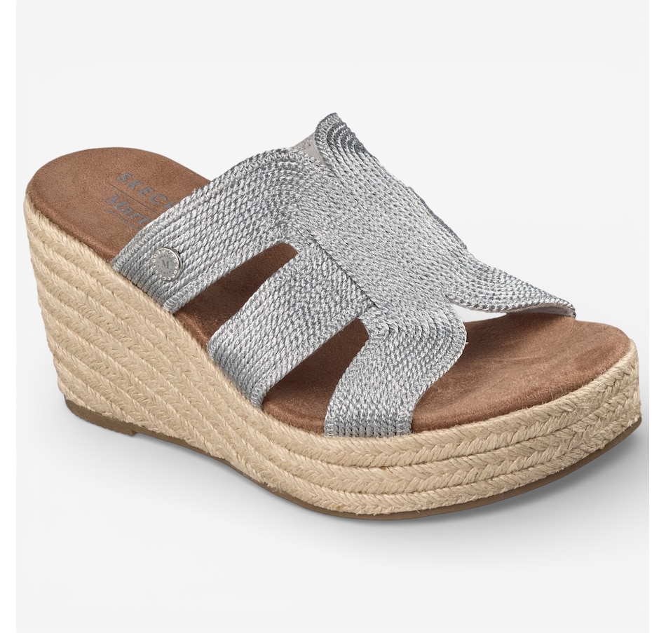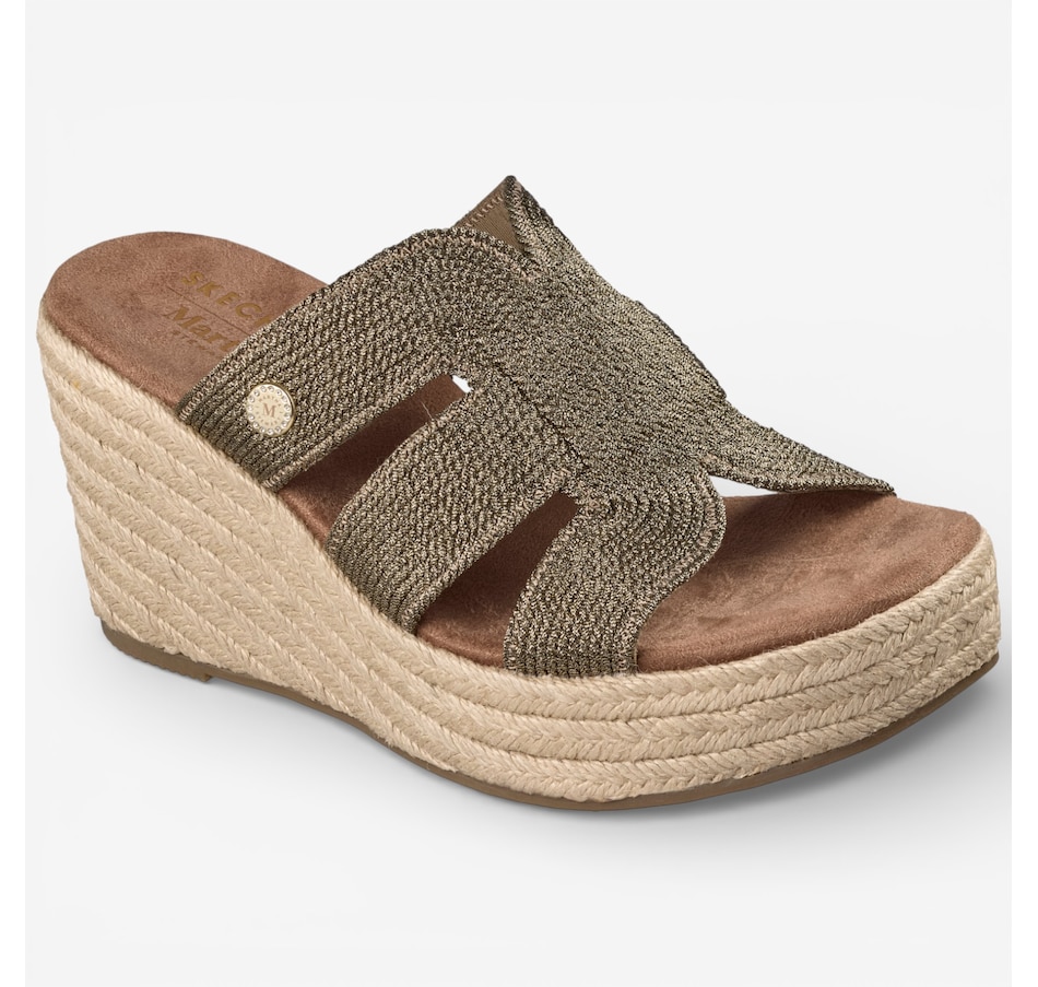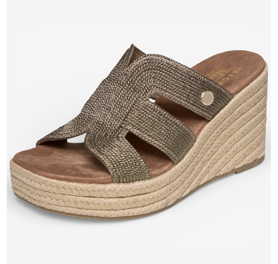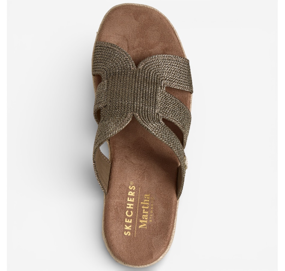 Effortlessly chic with a touch of modern glamour, the Skechers Martha Stewart – Iris metallic jute wedge sandal brings elevated style to warm‑weather dressing. Designed with a shimmering metallic jute H‑band upper, this easy slide sandal pairs beautifully with everything from breezy dresses to casual denim. The jute‑wrapped wedge midsole adds natural texture and a flattering lift, while a cushioned comfort footbed keeps every step feeling soft and supported. Finished with a flexible rubber traction outsole for confident wear, this standout selection from the Skechers x Martha Stewart collaboration blends timeless sophistication with everyday ease.
