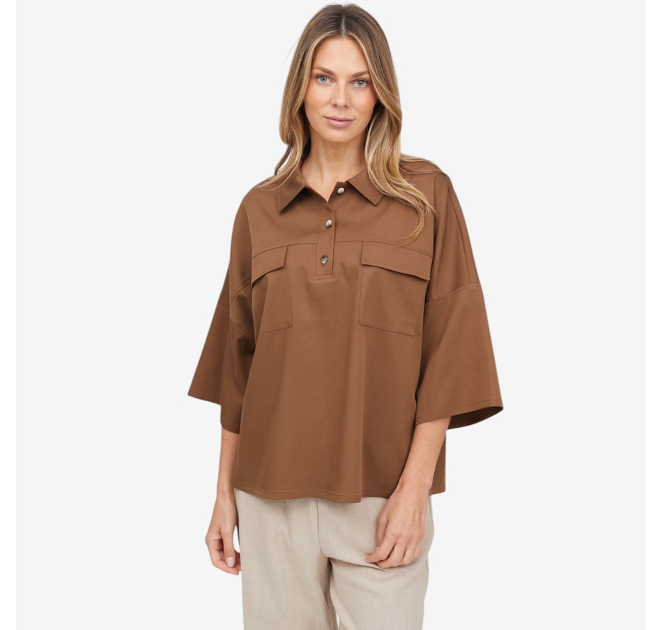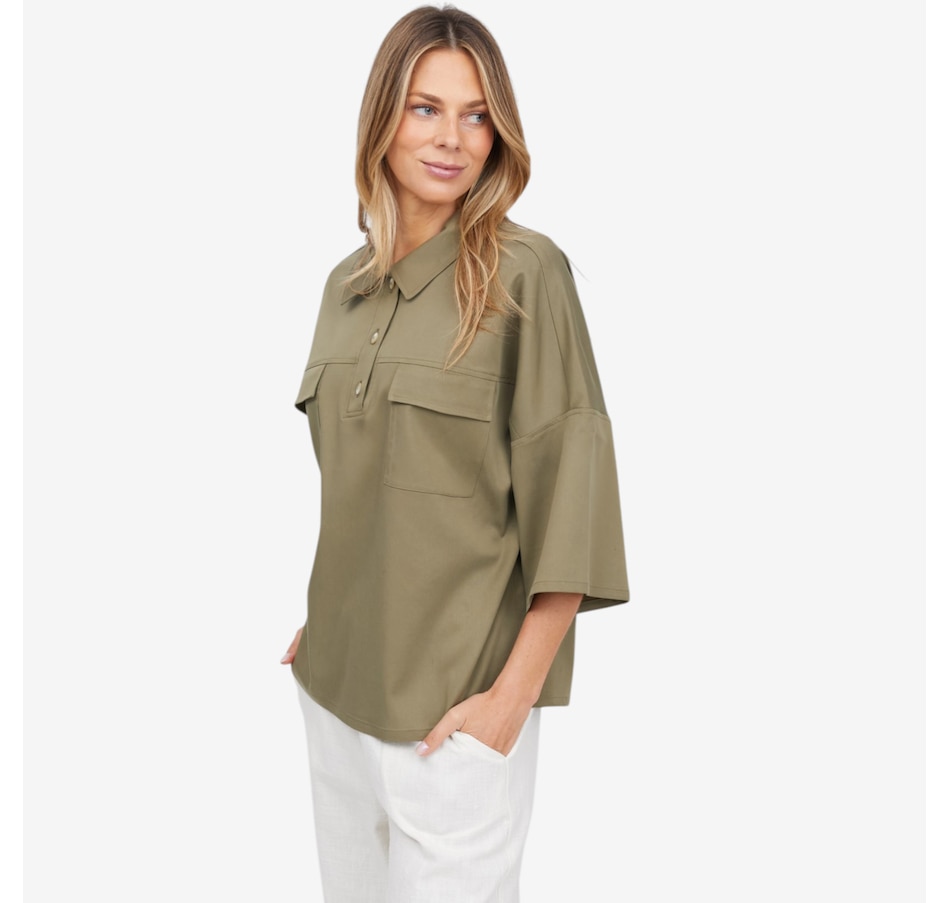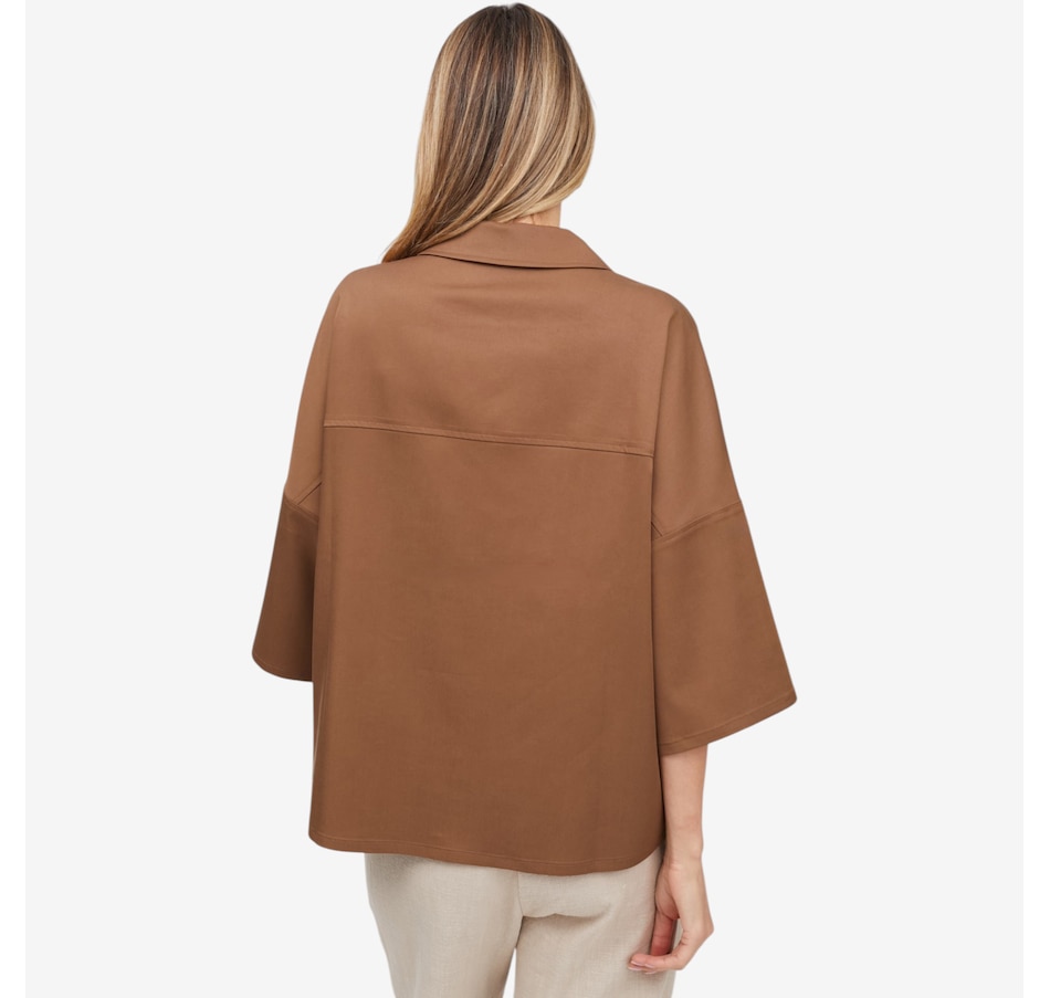 Add easy sophistication to your everyday lineup with Legacy’s Elan twill top, a versatile popover shirt designed to transition seamlessly all day long. Crafted from soft‑interior/smooth‑exterior twill, it offers a gently structured drape that feels polished yet comfortable. Chest pockets introduce subtle utility, while the collar and button‑front popover design lend a clean, timeless look. The drop‑shoulder 3/4 sleeves enhance its relaxed modern shape, giving the silhouette an effortless feel without losing refinement.