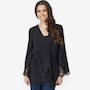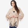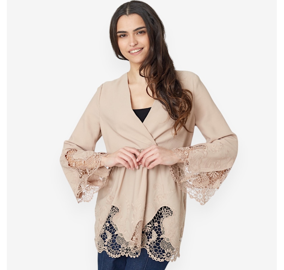 • Fitted, long flared sleeves, pull-on, crossover v-neckline, intricately embroidered lace hemline/sleeve trim