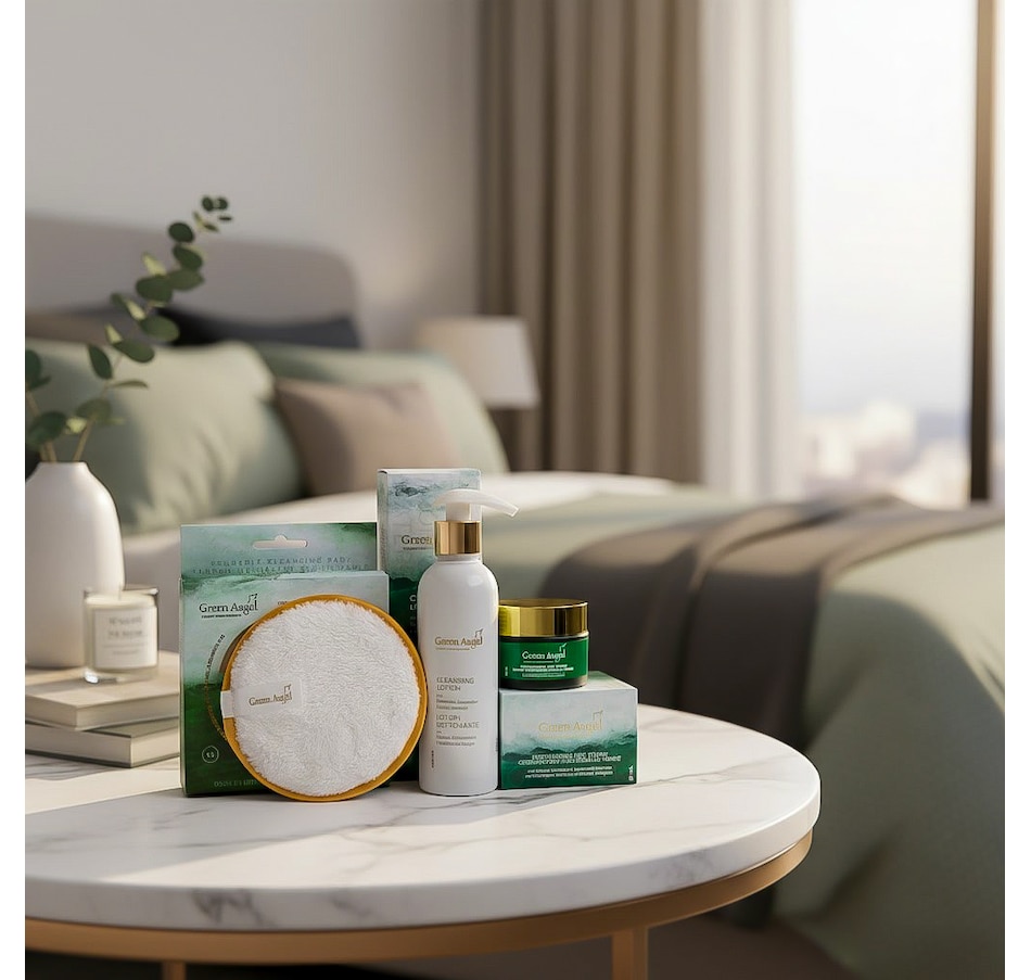 This basic Green Angel luxury Irish skincare bundle includes a cleansing lotion, a day moisturizer, and a bonus reusable cleansing pad.