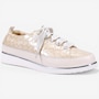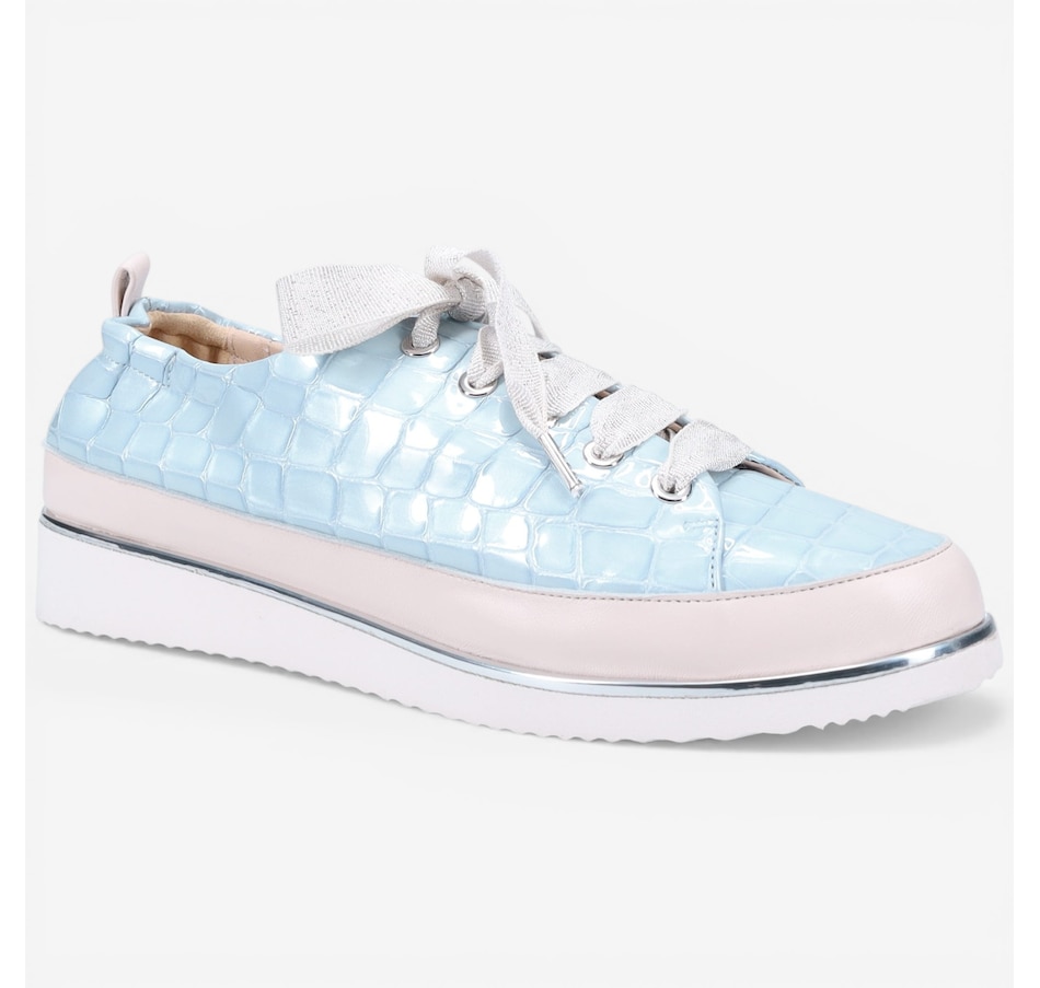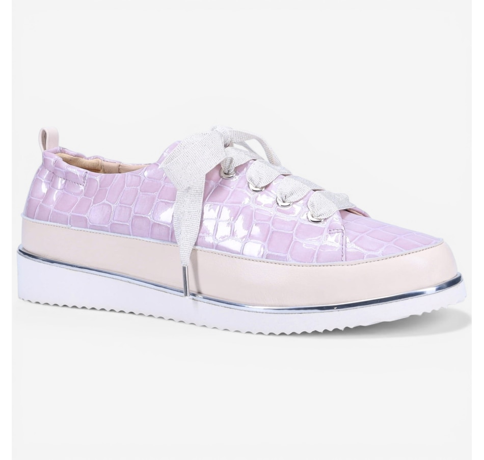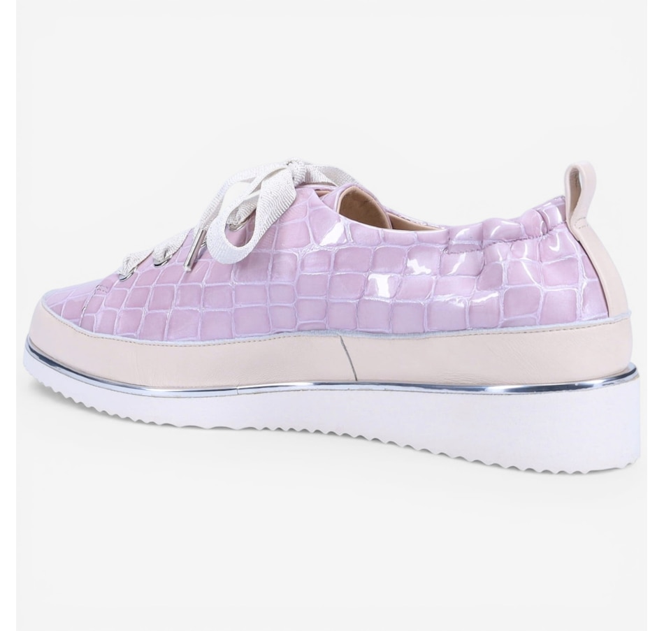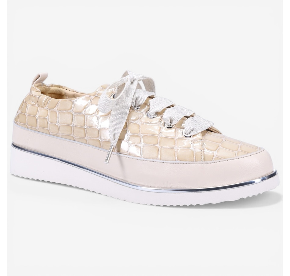 Step into modern luxury with the Novella Avara ultralight lace‑up sneaker from Ron White, a chic fusion of high‑shine style and slipper‑like comfort. Crafted in Italy, this standout shoe features a sleek pearlized croco patent upper accented by a contemporary mirror welt for a polished, fashion‑forward finish. Inside, sumptuous double padding and seamless Sacchetto construction surround the foot with exceptional softness and flexibility. The ultralight rubber wedge outsole adds subtle lift while keeping each step feather‑light. Finished with classic lace‑up styling for an adjustable fit, the Novella Avara delivers the ideal balance of couture attitude and everyday wearability.