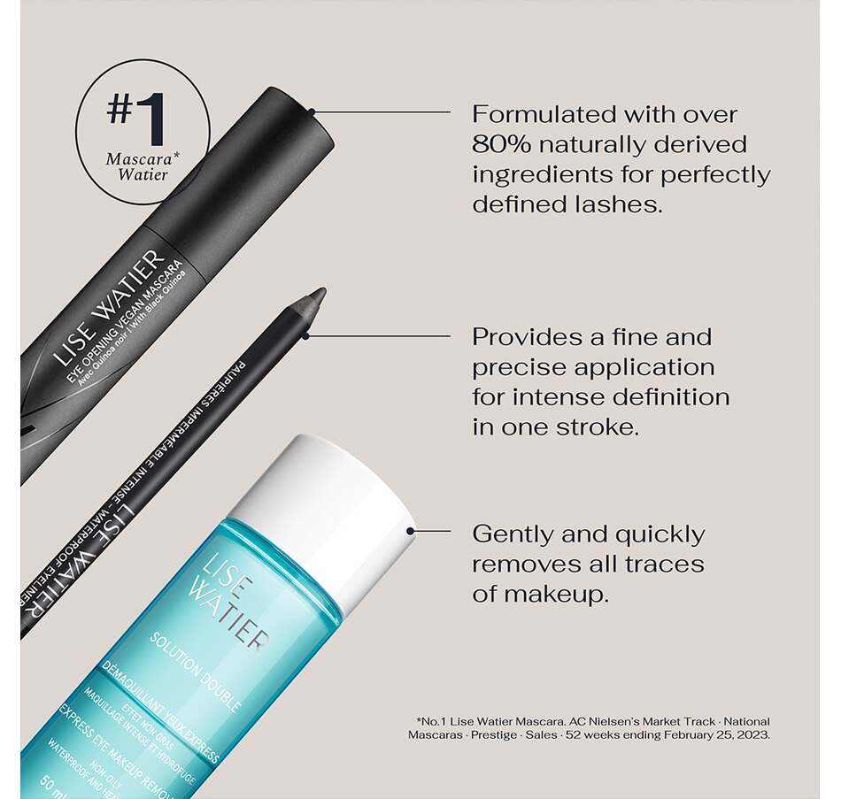 This vegan mascara features fortifying and revitalizing properties and is enriched with black quinoa, vitamin E and minerals. The creamy and velvety eyeliner glides on easily to add depth and make lashes appear more voluminous. Its waterproof formula provides a long-lasting and flawless result that stays in place all day long. The dual-phase eye makeup remover gently removes all traces of makeup, even those with waterproof formulas.