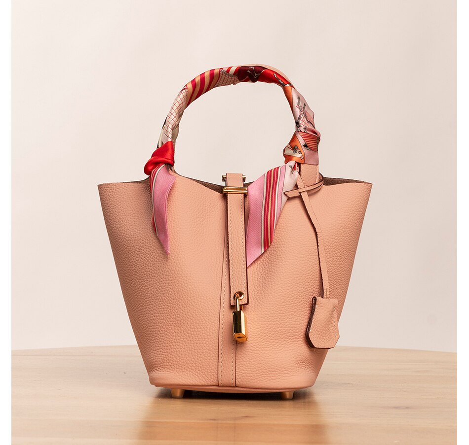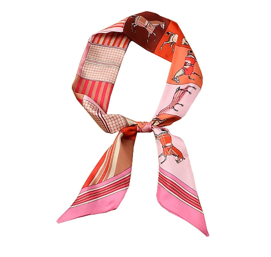 Accessorize every look in absolute style with the Charlotte scarf from Katherine Karambelas. This mulberry silk toile features striped and horse motifs.