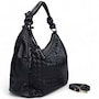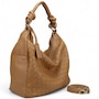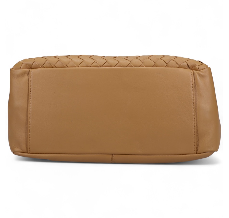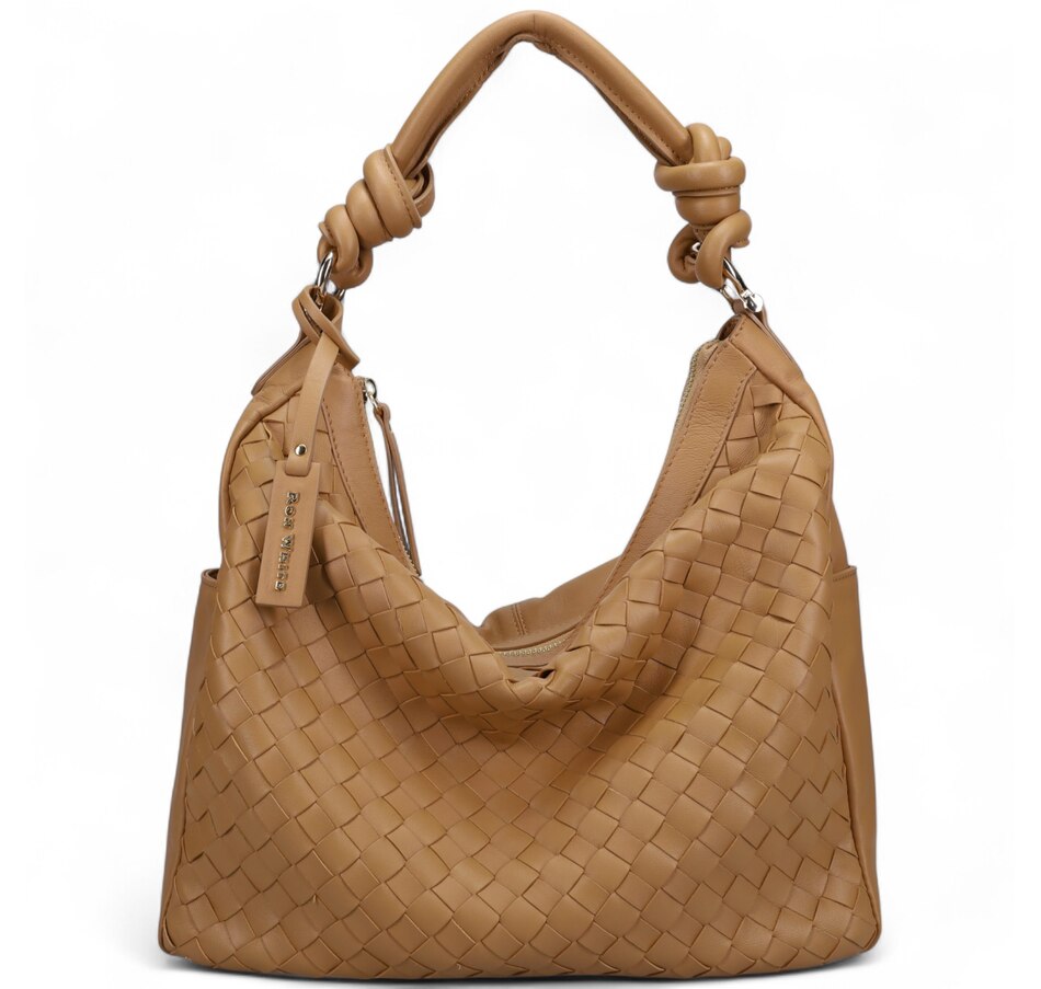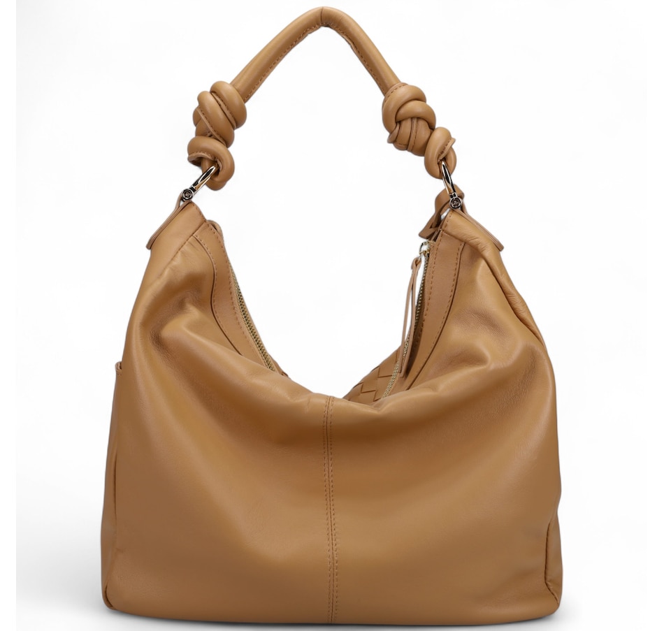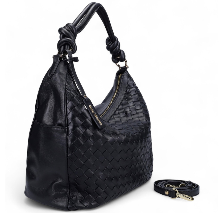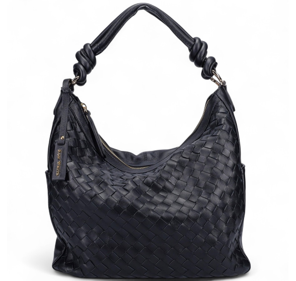 Fairmont Hobo Bag in Buttery Nappa and Woven Nappa. Jewelry Grade Platino Hardware. Top zip closure. Made in Italy.