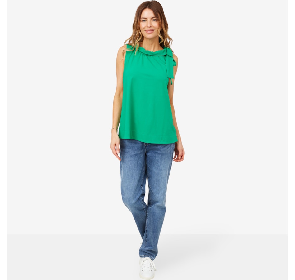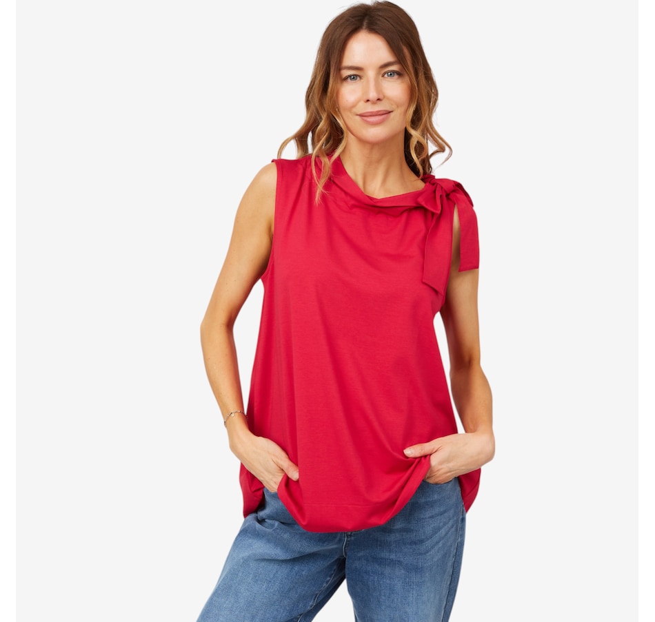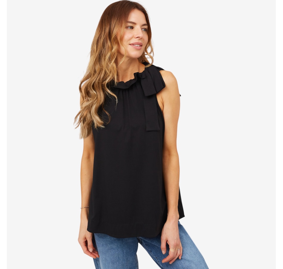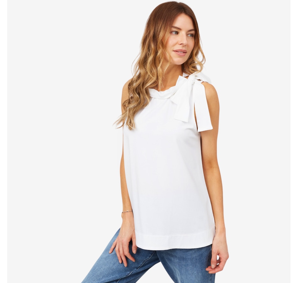 You'll add something beautiful and irresistible to your look with this sleeveless bow top by Stacy London.