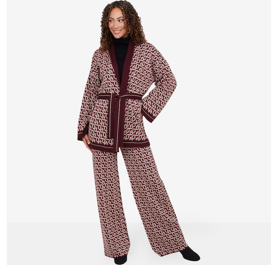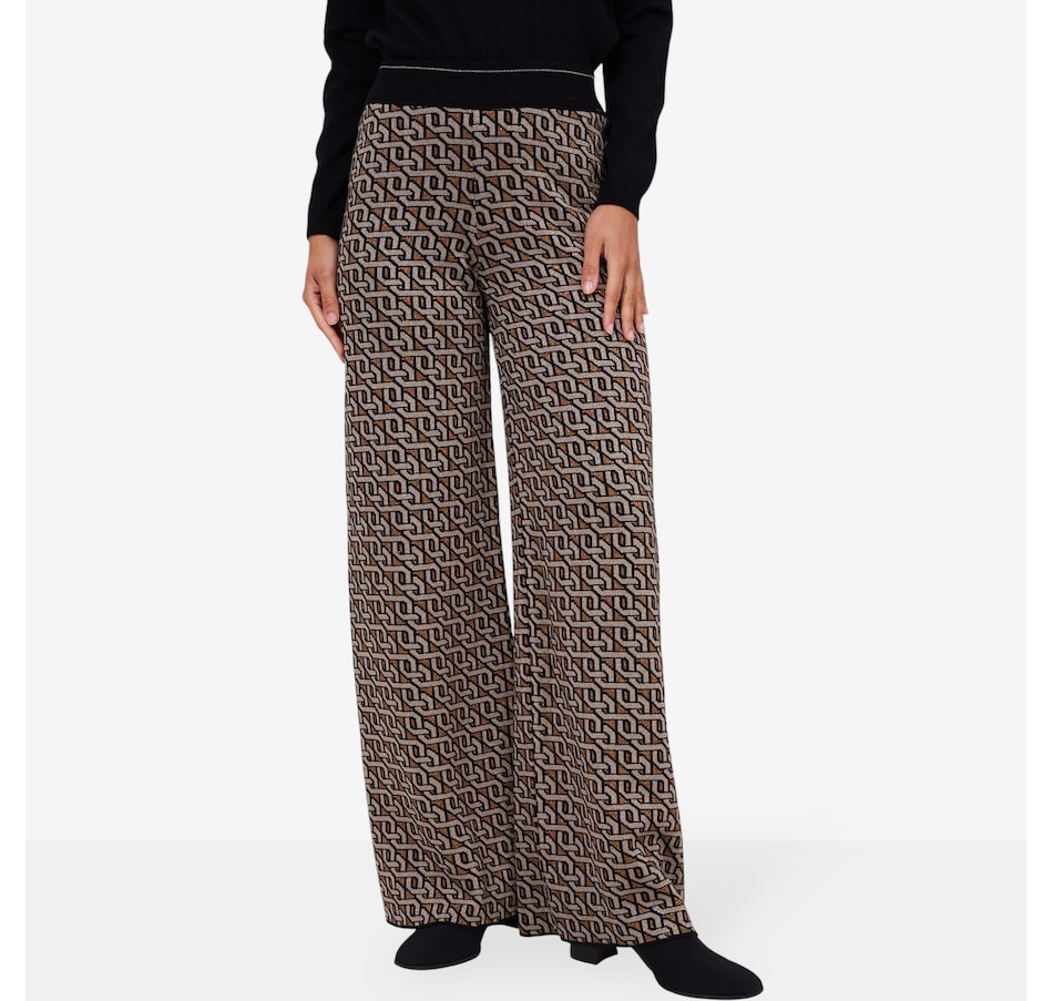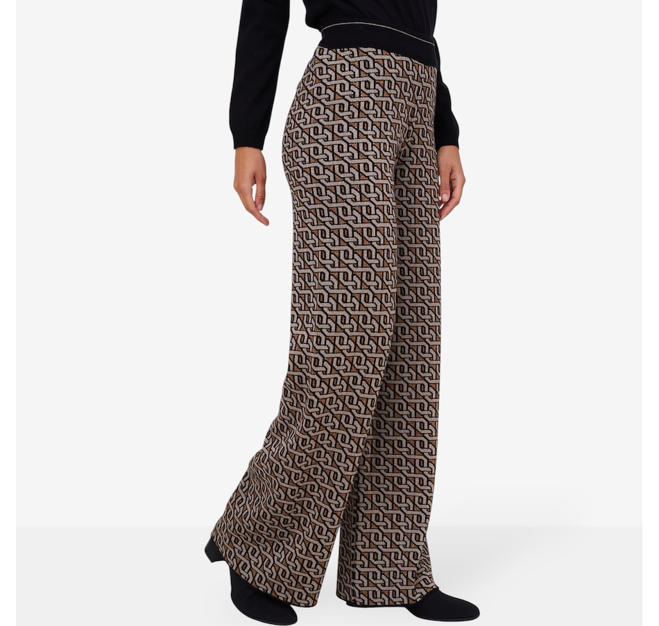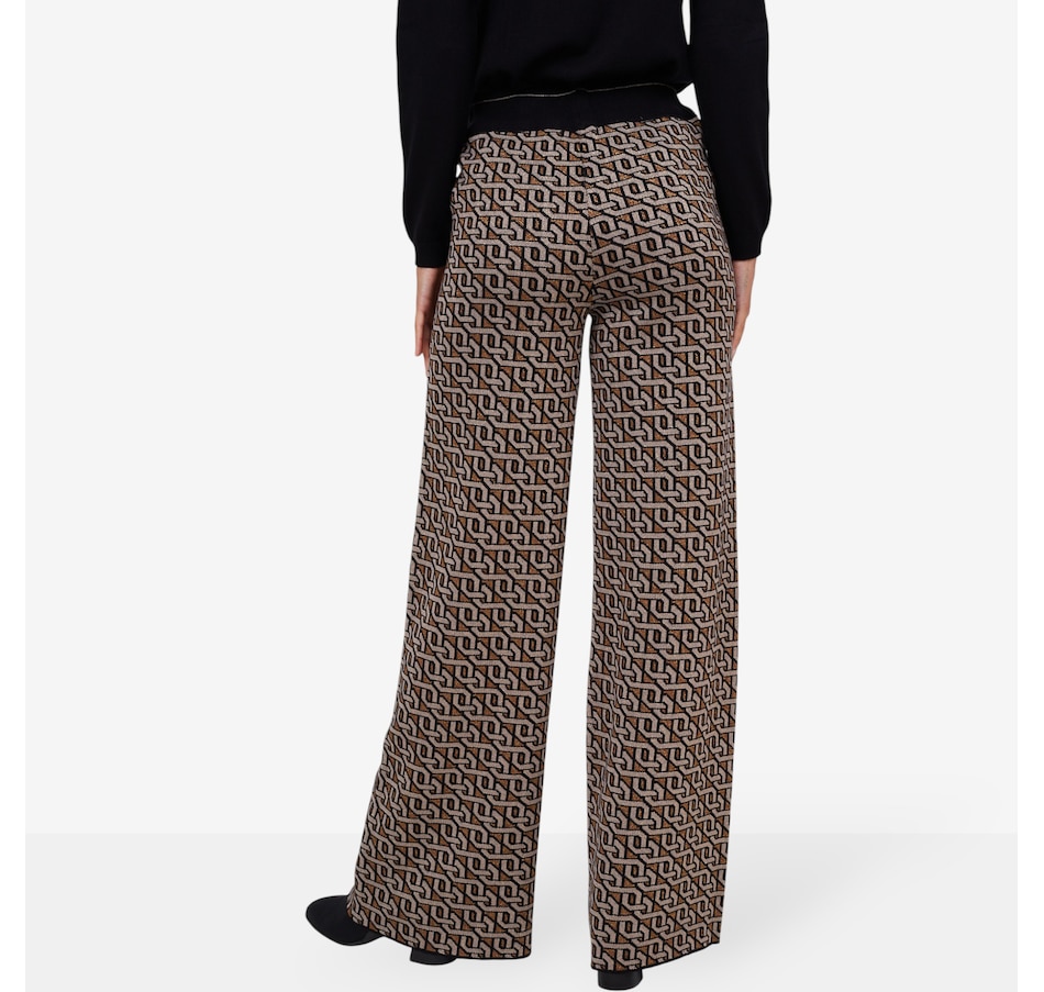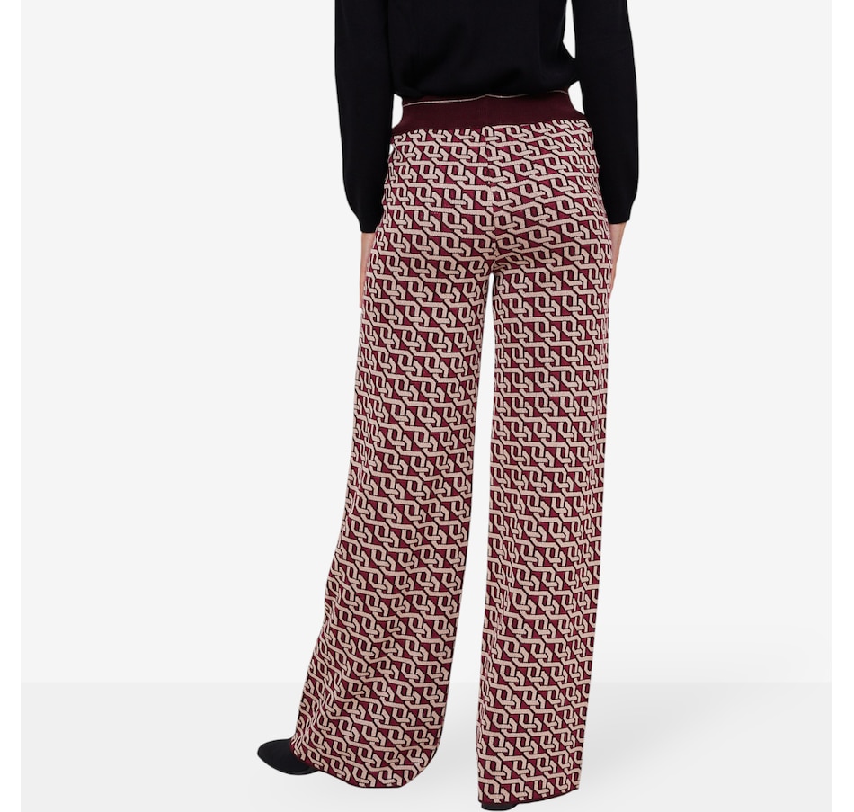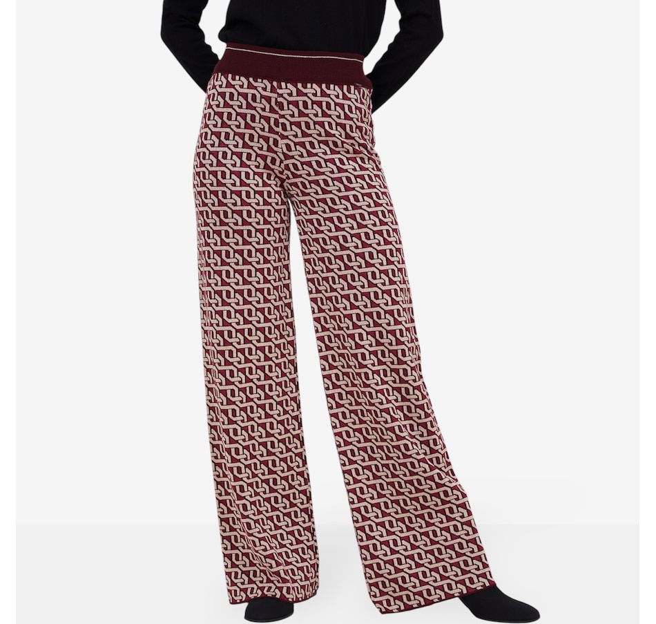 This eye-catching knitted trouser has an all-over geometric pattern and a wide-leg silhouette with a fluid drape. The elastic waistband makes for an easy pull-on fit, and the soft-touch texture boasts a subtle shine. This statement piece is ideal for bold yet comfortable looks.
