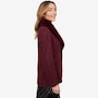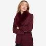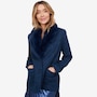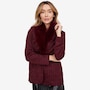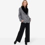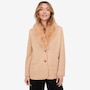 This is a fully tailored blazer with an inner construction of fusible and shoulder pads. It is constructed from a four-way stretch double knit tweed for great mobility and comfort. The blazer has a three-button closure with keyhole buttonholes and a detachable faux fur beaver collar.