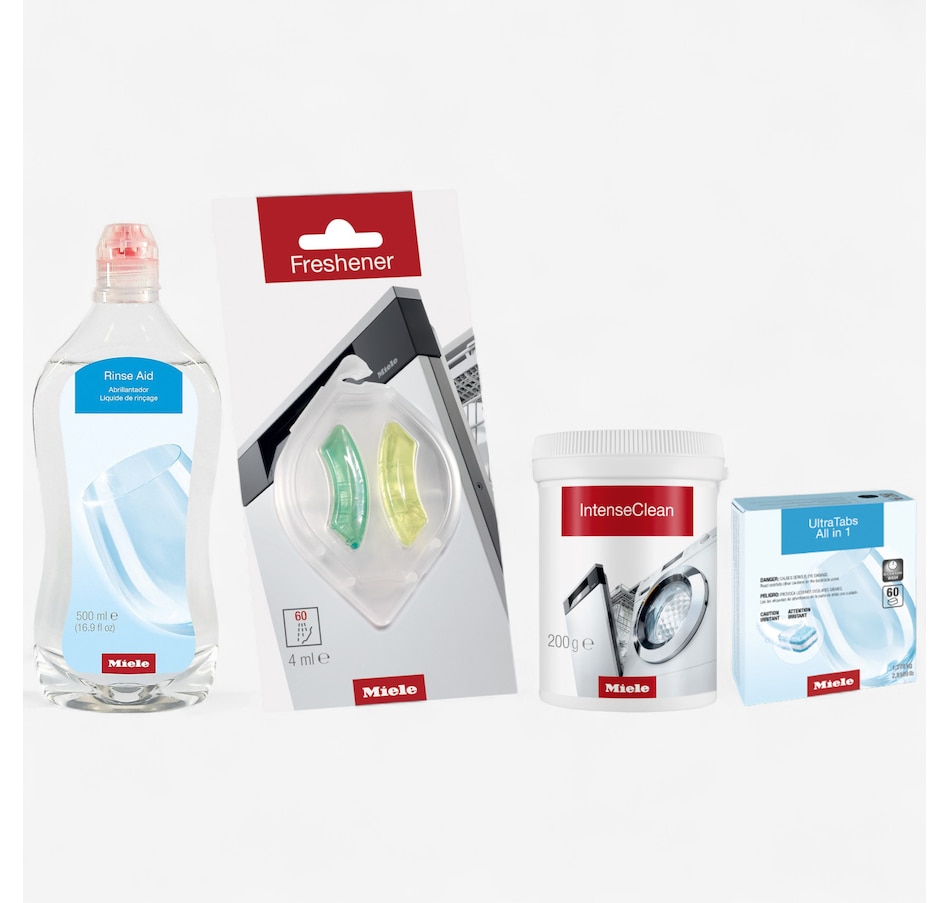 This dishwashing value package from Miele features UltraTabs, a rinse agent, dishwasher freshener and IntenseClean for best cleaning results in your dishwasher.