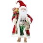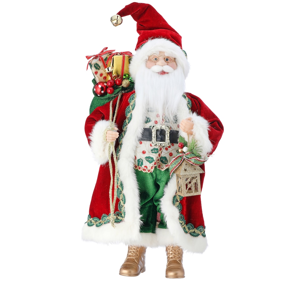 This plush Santa figure is decked out and ready to make the holiday rounds in style with his bag of posh gifts over one shoulder, and a holly-glittery lantern in his other hand. The attention to detail is over the top with gold boots, brocade and fur-trimmed coat and pants, a glittery vest with a belt buckle, a fur trimmed hat with bell, and wire-rimmed spectacles.