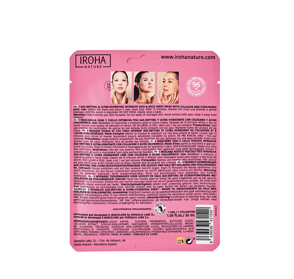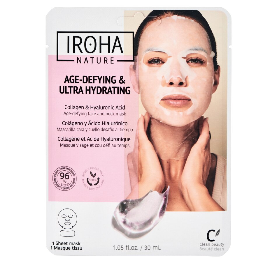 Iroha Nature Age defying and Ultra Hydrating sheet face and neck mask with collagen and hyaluronic acid.
