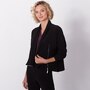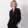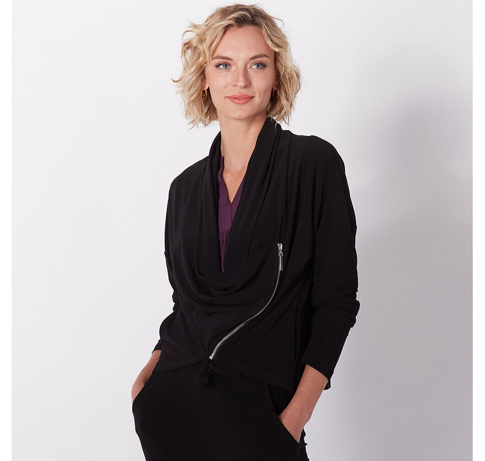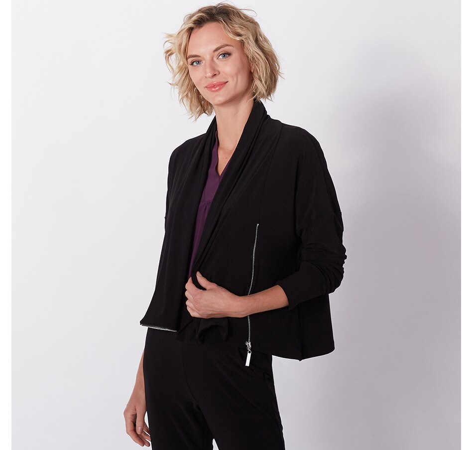 • Asymmetrical zipper closure, waterfall collar, drop shoulders, long sleeve, short brazil knit jacket, hidden side pockets
