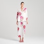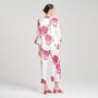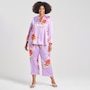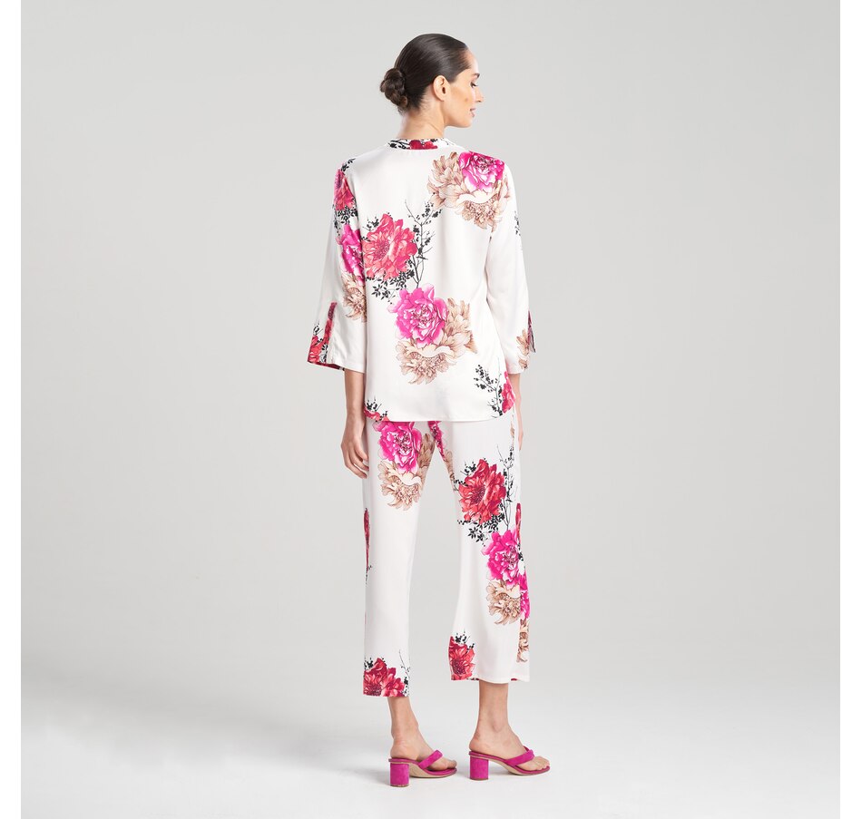 • Printed satin OTH PJ set, floral printed, 3/4 length sleeves with slits, mandarin collar, drawstring waistband closure, wide leg pant