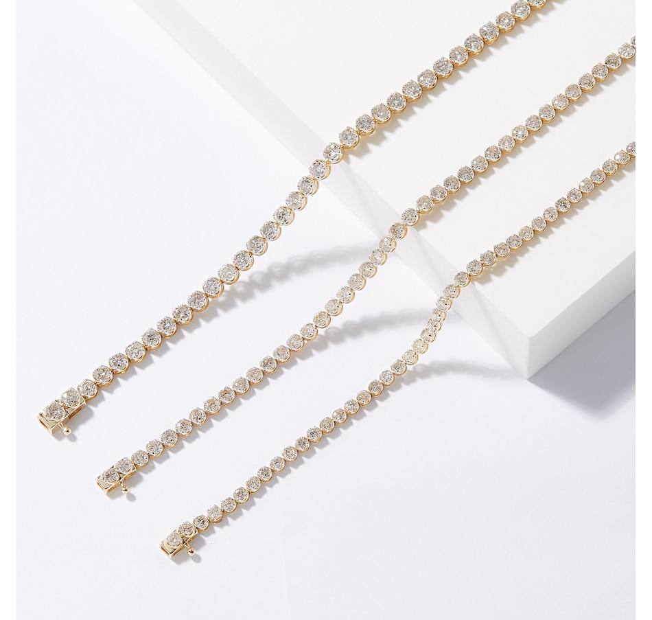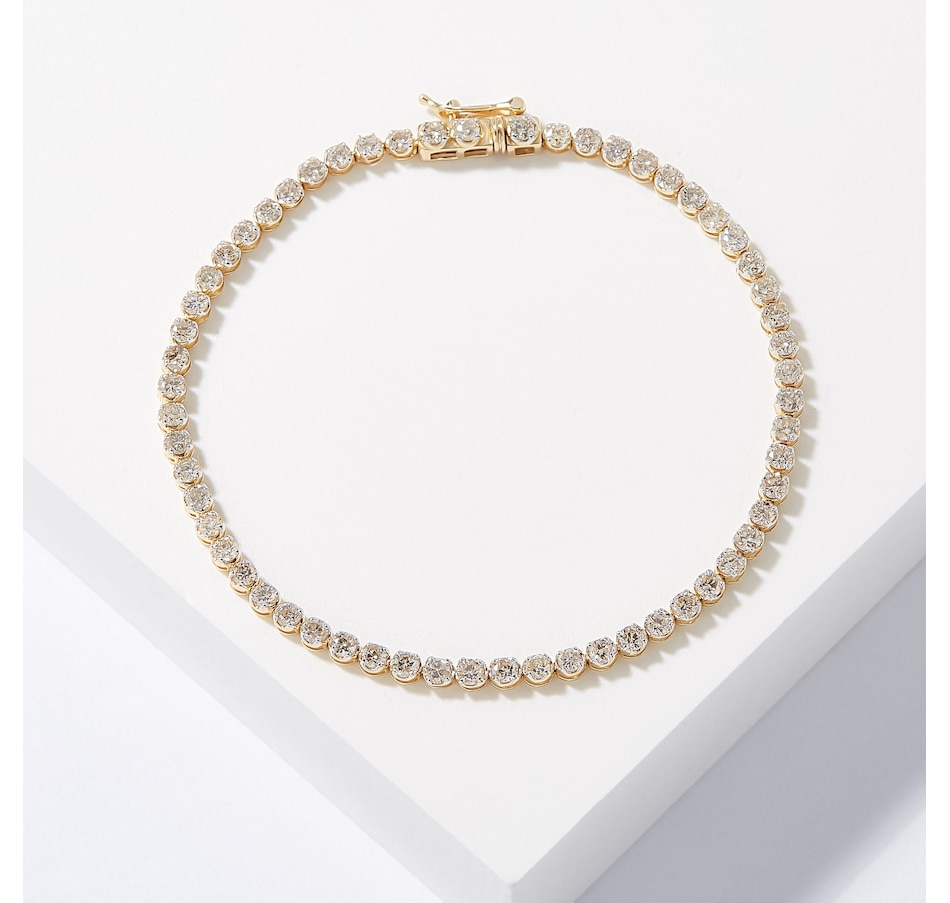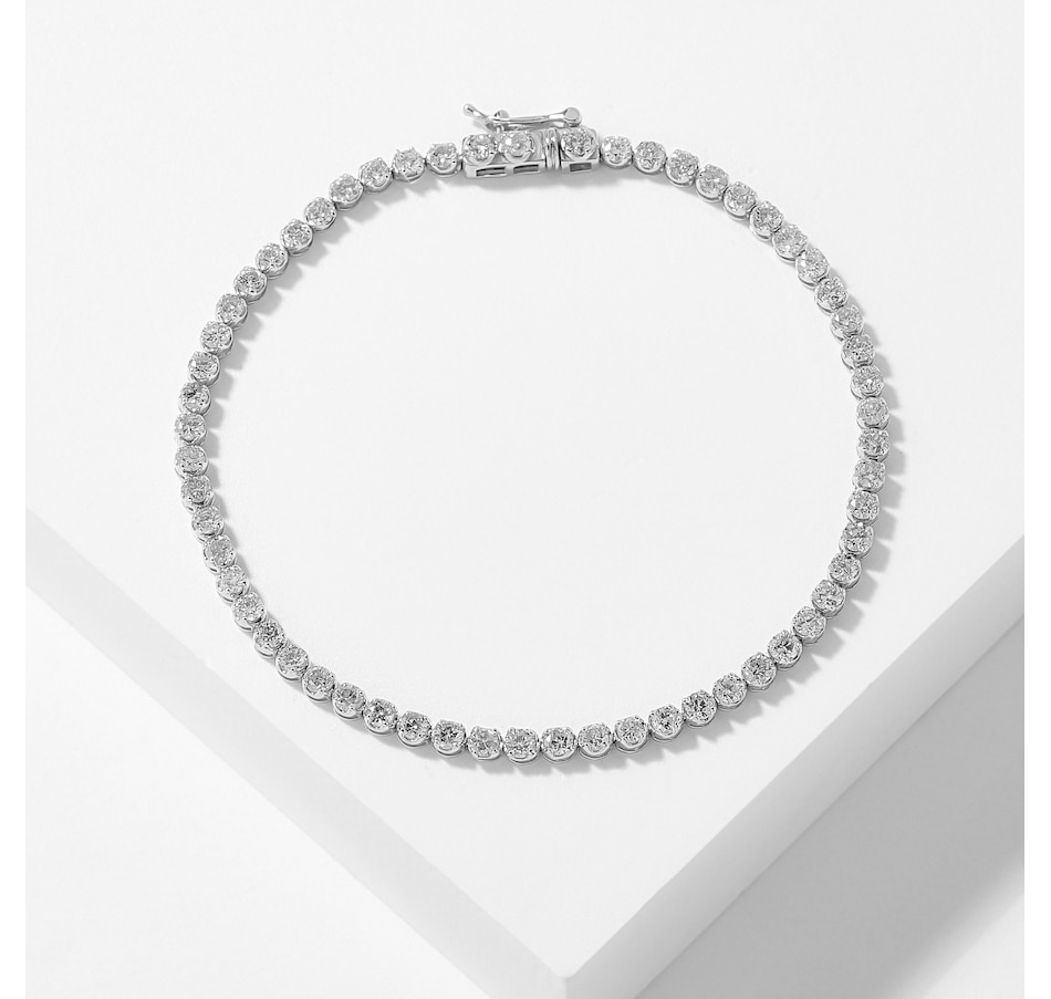 • (59) round shape, prong set and faceted diamonds (3.00 av. ctw bracelet), or (54) round shape, prong set and faceted diamonds (4.00 av. ctw bracelet), or (47) round shape, prong set and faceted diamonds (5.00 av. ctw bracelet)