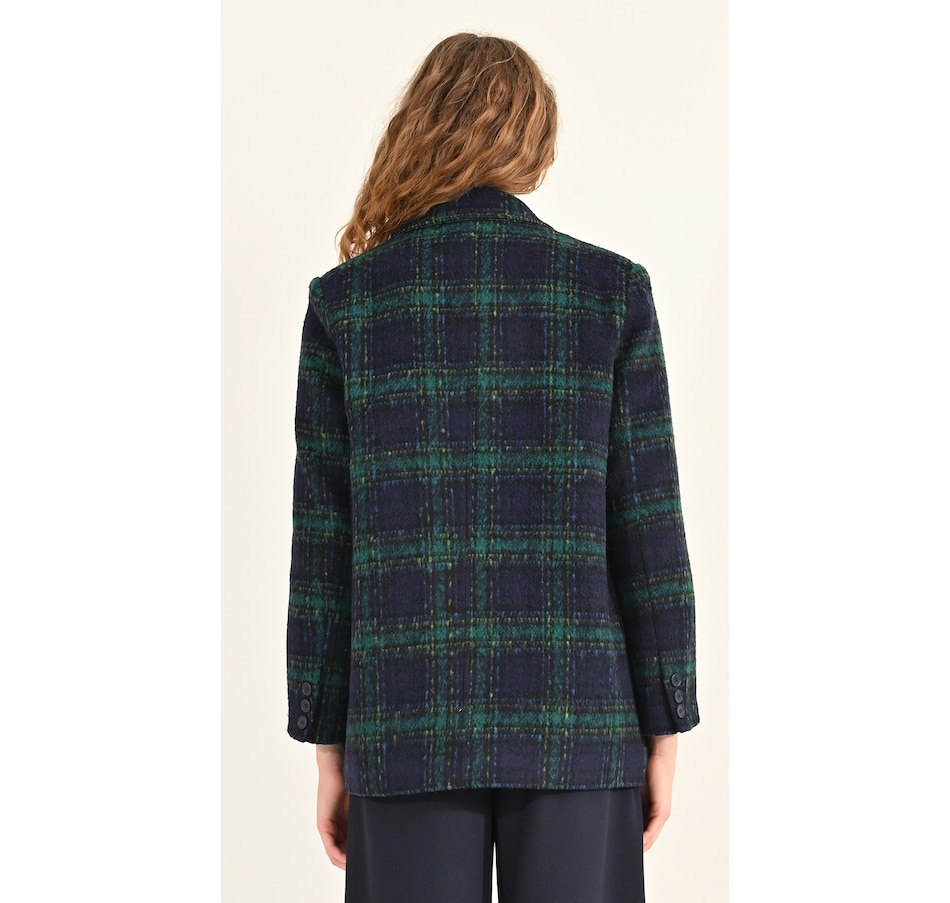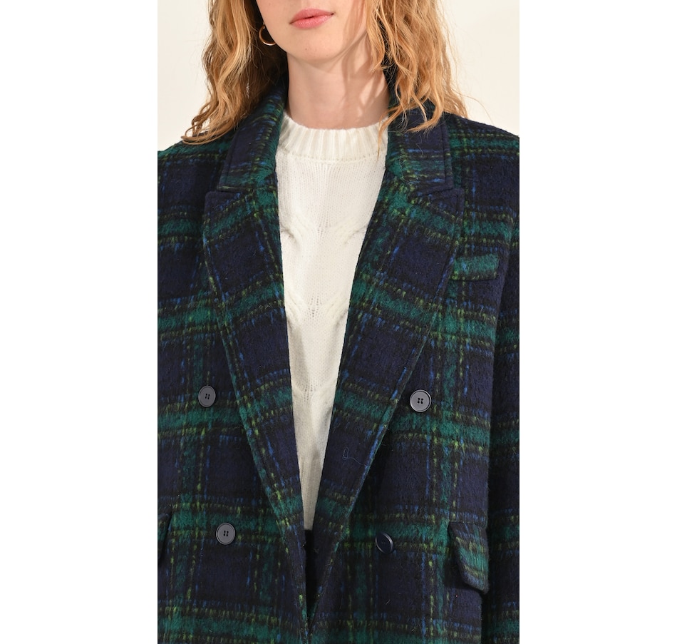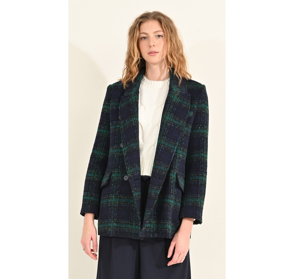 A classic piece with a twist, you'll finish your fall look in defined style with this plaid double breasted blazer from Molly Bracken.