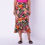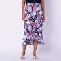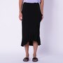 • Elastic at waist, slight hi-low hemline, fake wrap with frill along edge of wrap and hem