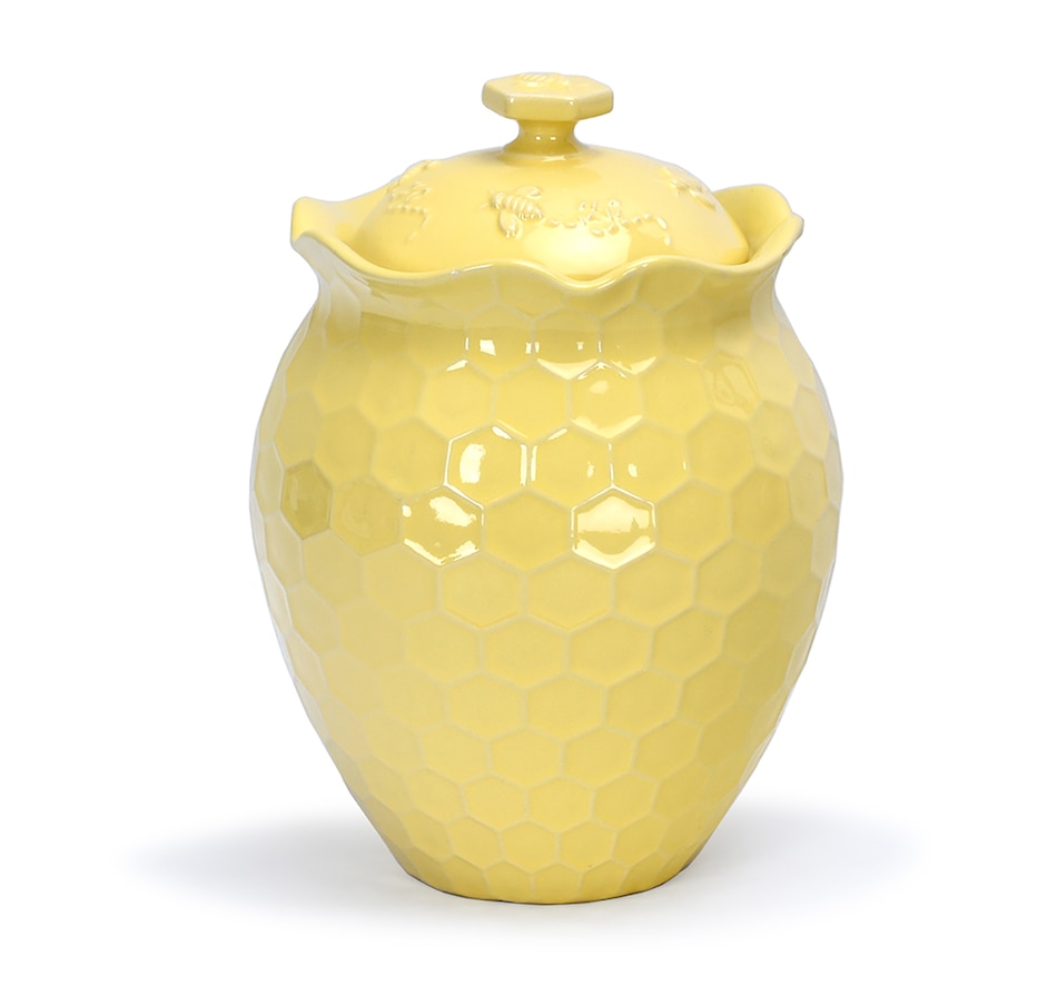 The traditional cookie jar design takes on a whole new look with sculptural honeycomb details around the sides and an elegantly ruffled top edge. The lid features embossed bumblebees buzzing around with an easy-to-grasp integrated handle.