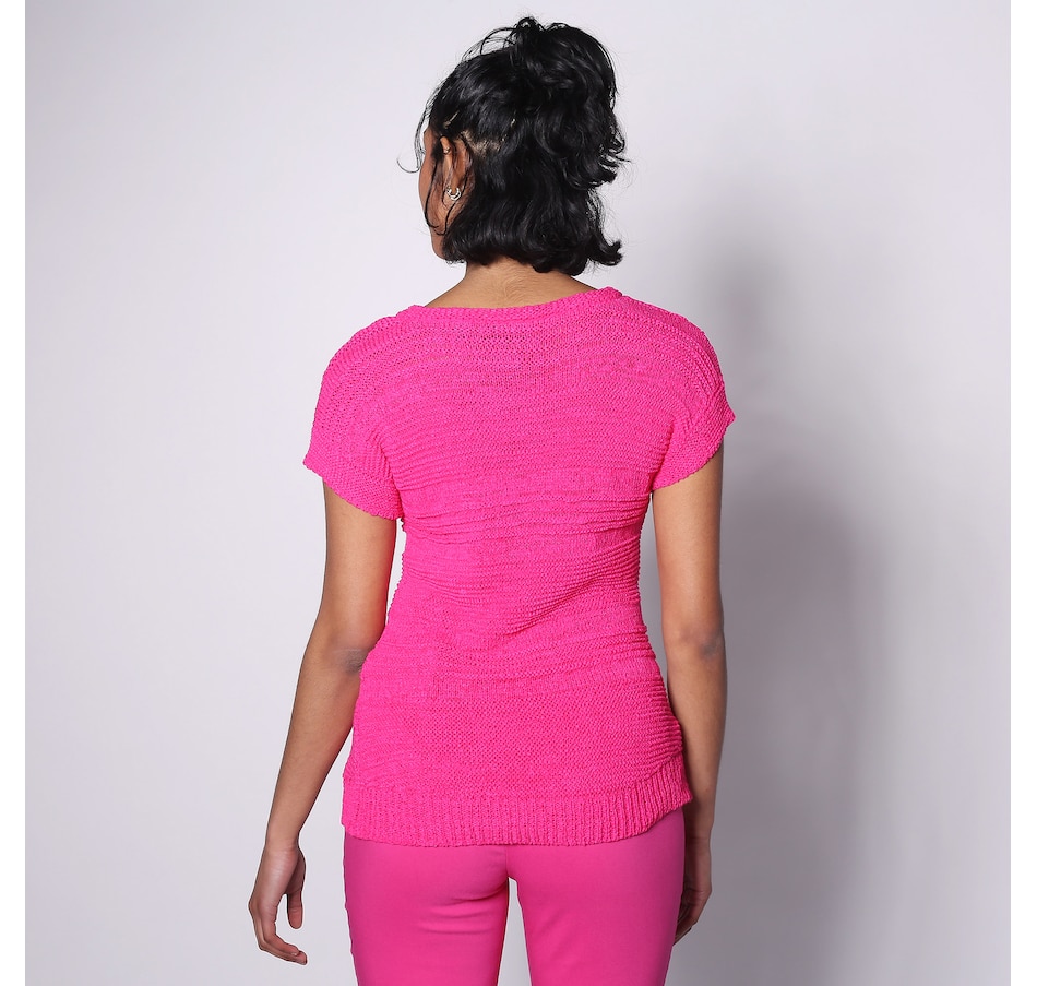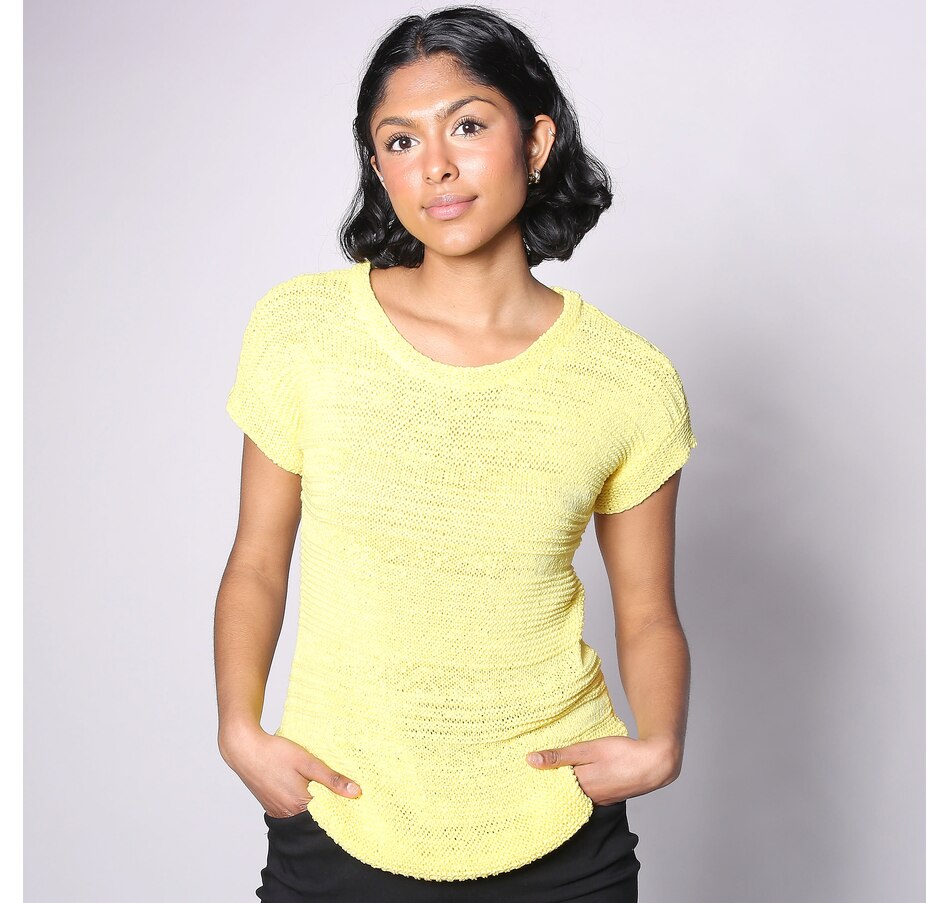 You'll centre your look with something undeniably stylish wearing this round neck tape yarn short sleeve top from Nina Leonard.