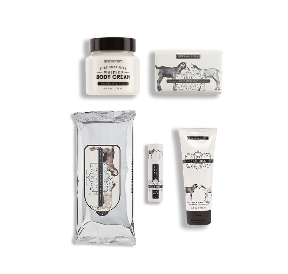 Discover the kindness of goat milk and botanicals with the Beekman 1802 5-Piece Discovery Collection! Featuring five hero products, all packed with creamy goat milk, to cleanse and moisturize every body and everybody. With a Bar Soap and 30 Facial Cleansing Wipes, you can cleanse skin at home and on-the-go, then moisturize with the Whipped Body Cream, Hand Cream, and Lip Balm. Beekman 1802 products are always petroleum, paraben, sulfate, phthalate, formaldehyde, and talc-free.
