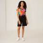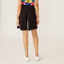 • High waisted, clean at the front, elasticized at the back waist band, grommet's belt front extensions & ties for the look and function, front overlap pannels; 9" inseam